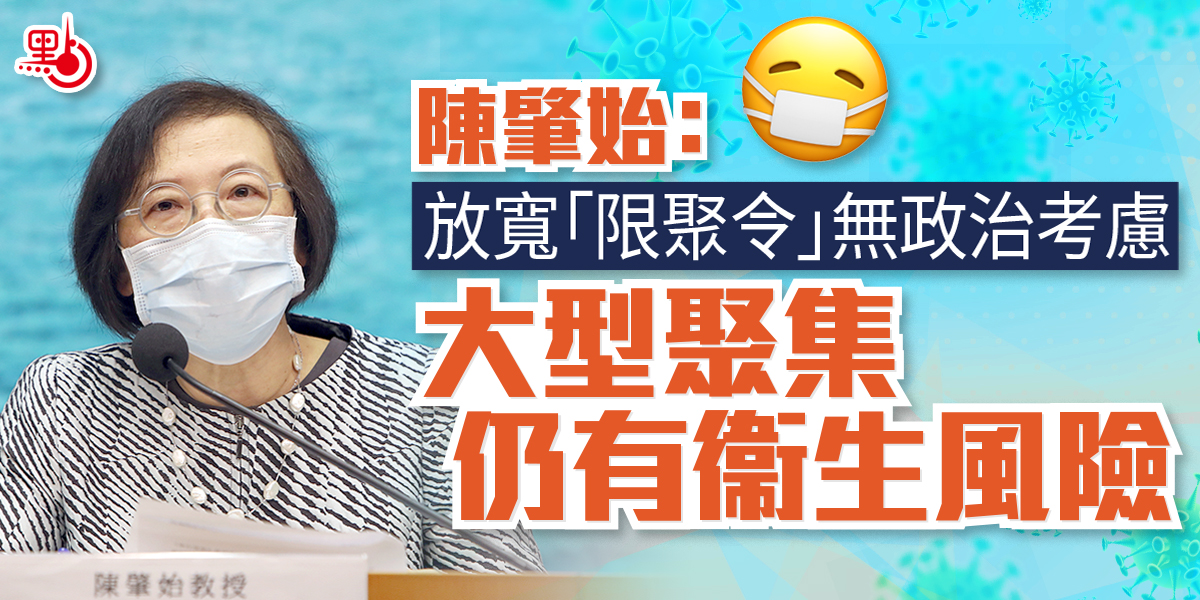 食物及衞生局局長陳肇始今日(16日)表示,政府放寬限聚令人數上限至50人,完全是公共衞生考慮,並無政治考慮。而目前大型群組聚集,仍有公共衞生風險,因此不會一下子取消「限聚令」。