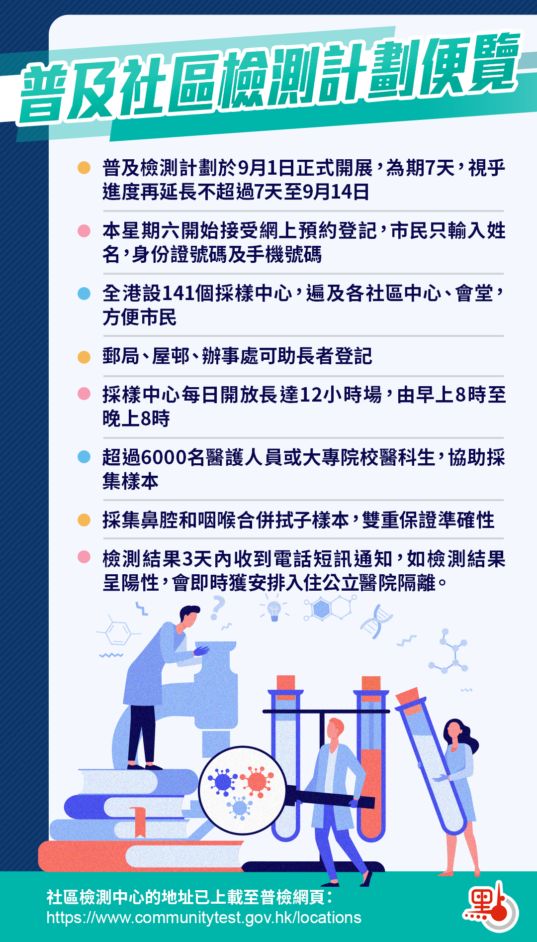 政府今日(28日)公布,普及社區檢測計劃將在9月1日起推行,計劃共進行至少7天,普及檢測會否再延長7天將視乎情況。在計劃下,為方便市民進行檢測,政府在18區設置141個檢測中心,較大的場地最多可設置10個採取站,場地較細則只得5個採取站。