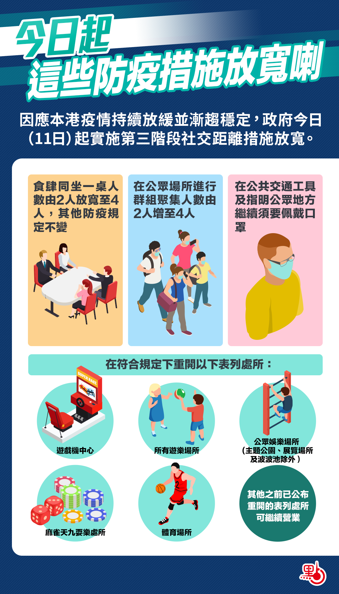 因應本港疫情持續放緩並漸趨穩定,政府今日(11日)起實施第三階段社交距離措施放寬。