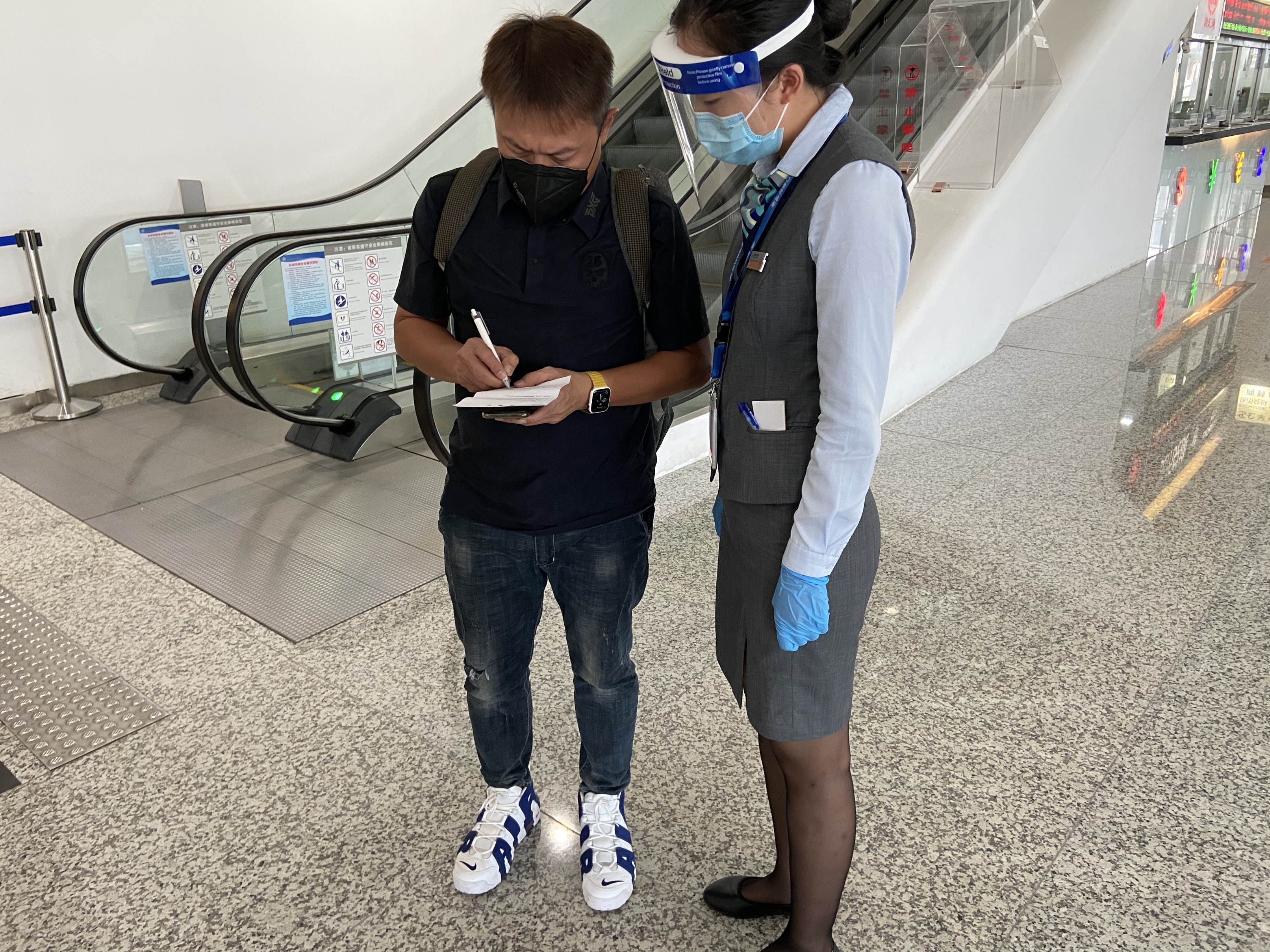 記者在現場看到,旅客抵達後,工作人員會對核檢報告進行檢查,預審旅客航班資訊、入境國家簽證資訊、行李托運等,並聯繫香港機場進行旅客是否可以登機的確認,現場還會列印一份供覆核使用的登機牌。旅客抵達海天碼頭後,還需要到櫃枱與航司再次辦理登機牌。