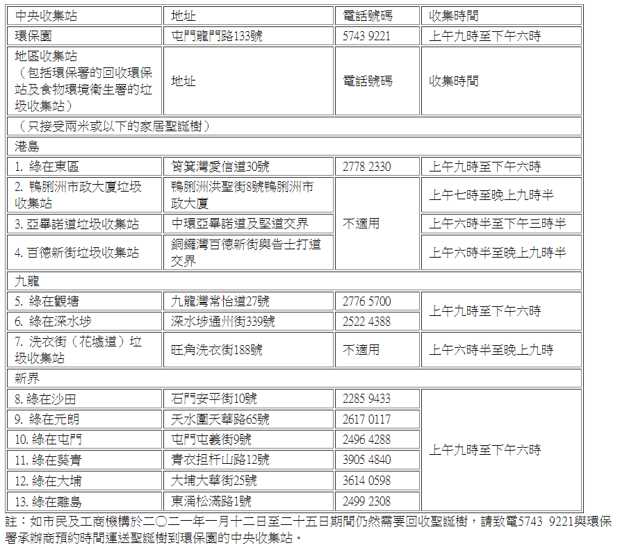 署方表示,是次計劃只限於回收天然聖誕樹,聖誕樹在送往回收前須拆除燈飾、裝飾物及膠帶等物品,以免影響其回收再造的過程;並鼓勵市民將其他小型植物,包括如聖誕花重新栽種,至於塑膠製的聖誕樹及裝飾物則可貯存再用,以實踐惜物減廢。