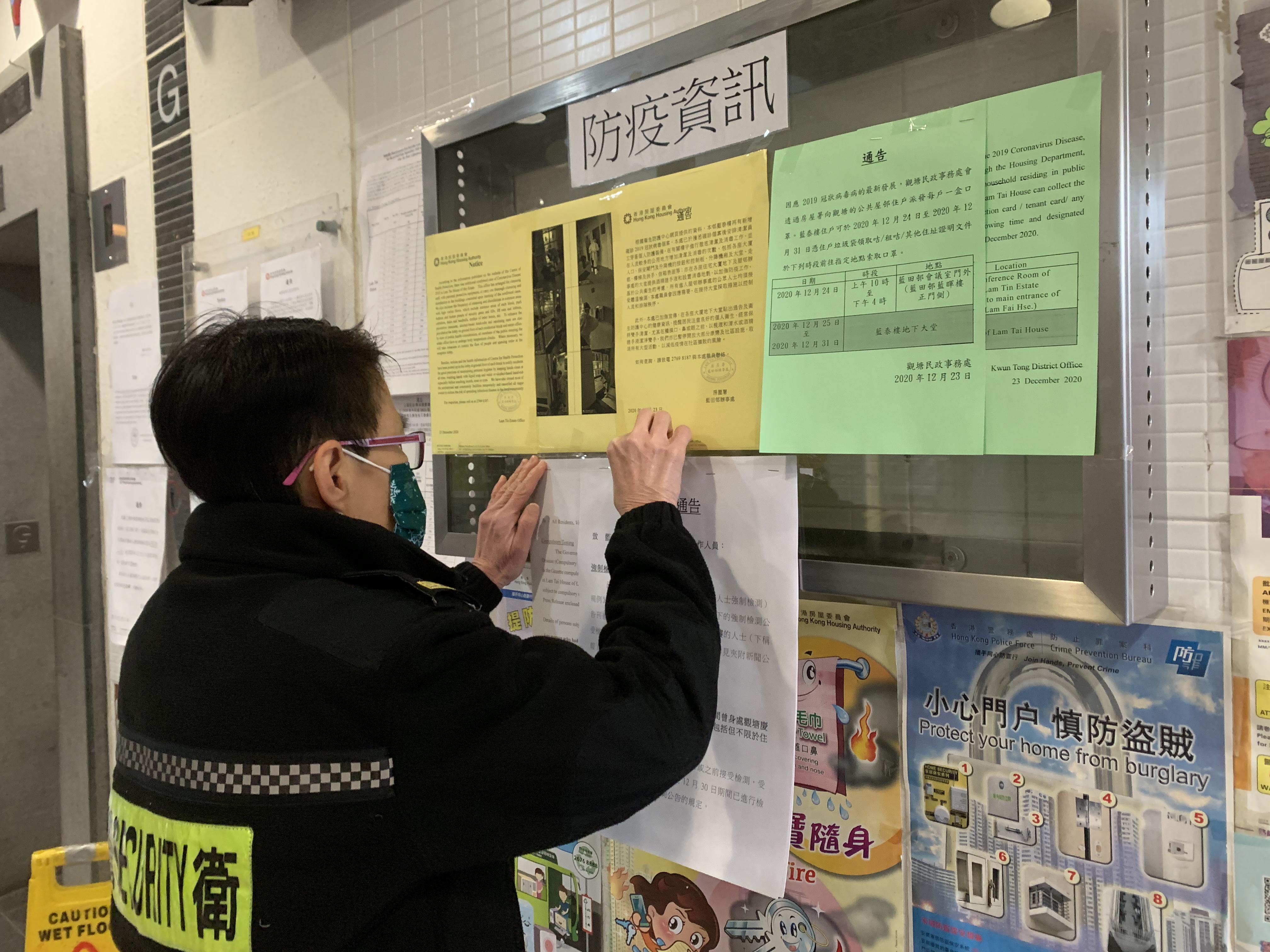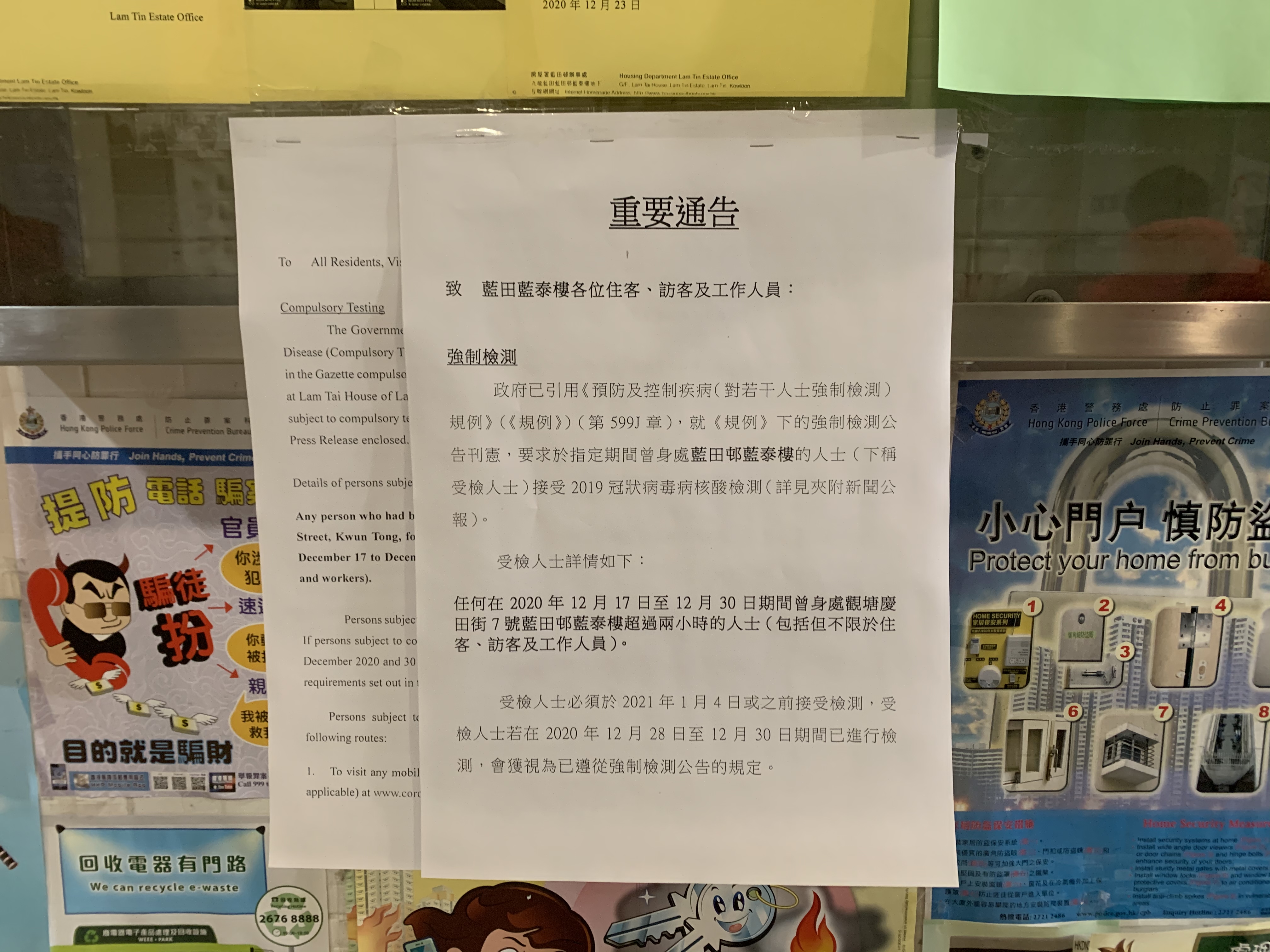 在藍田邨藍泰樓,出入的居民全然不知有第二次強制檢測的安排,感到非常徬徨。而在昨日(31日)下午5時20分,才有人在布告欄張貼相關告示,距離政府刊憲遲了近一日,且告示上未有註明居民應前往的檢測中心具體位置。