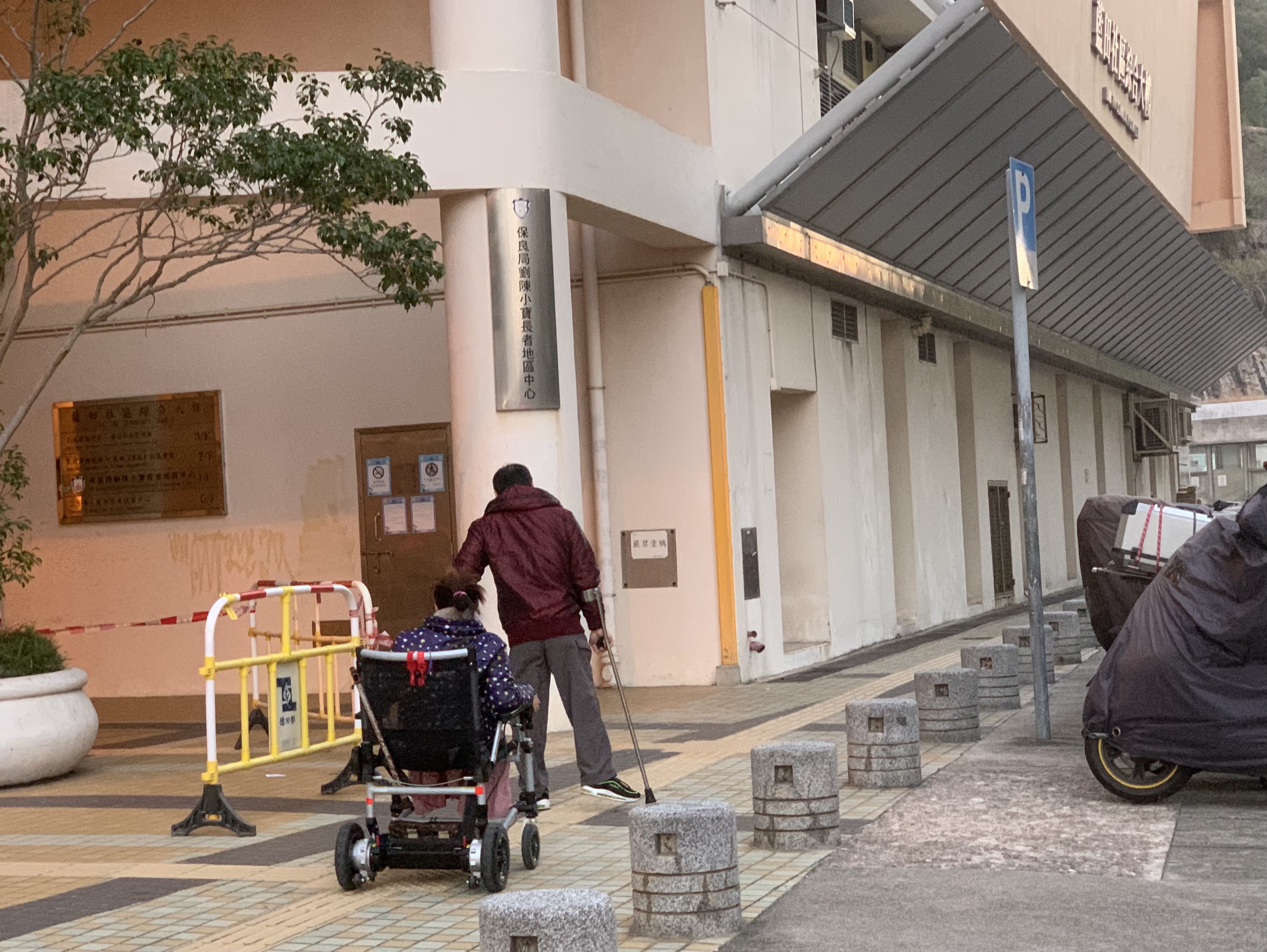 在藍田(東)社區會堂樓下,一對傷殘夫妻接受點新聞採訪時表示,他們用了近半小時才來到。