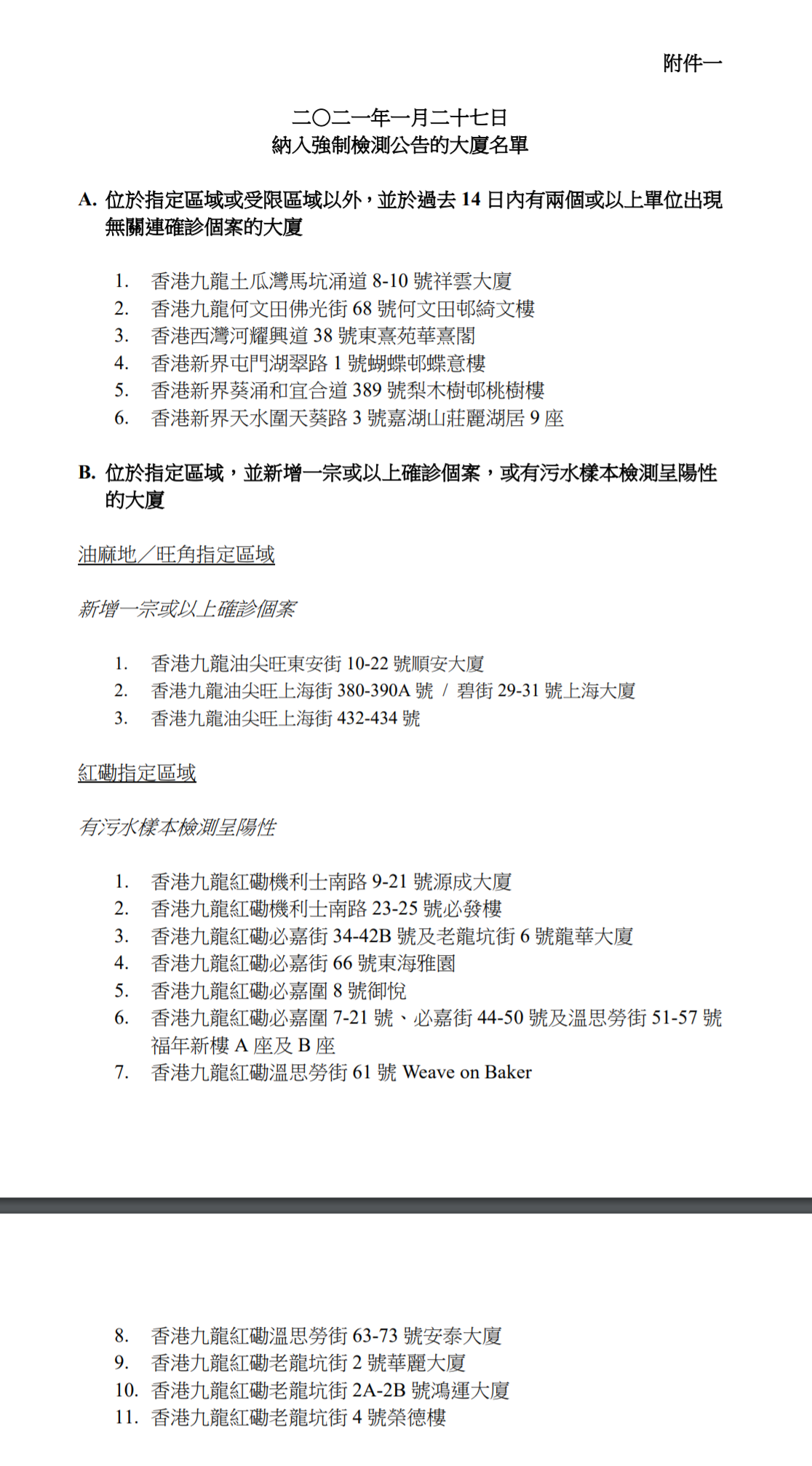 (一)任何在2021年1月14日至1月27日期間曾身處任何附件一所列指明地方超過兩小時的人士(包括但不限於住客、訪客及工作人員),須於1月30日或之前接受檢測。受檢人士若在1月25日至1月27日期間已進行檢測,會獲視為已遵從強制檢測公告的規定。
