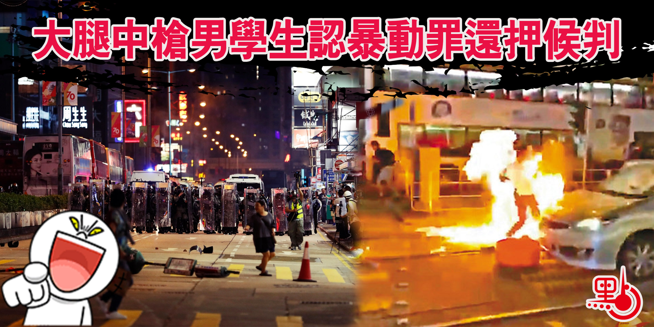 前年10月4日,大批蒙面暴徒在元朗釀暴亂,一名探員駕車至元朗大馬路遭暴徒包圍,下車後被圍毆及投擲汽油彈,一度變「火人」,探員為保命開了一槍及衝出重圍,一名14歲中學男生大腿中彈,送院接受手術,並於翌日被捕。現年15歲的被告昨在粉嶺裁判法院少年法庭承認暴動罪,主任裁判官蘇文隆下令只索取教導所報告,被告要還柙至4月7日判刑。