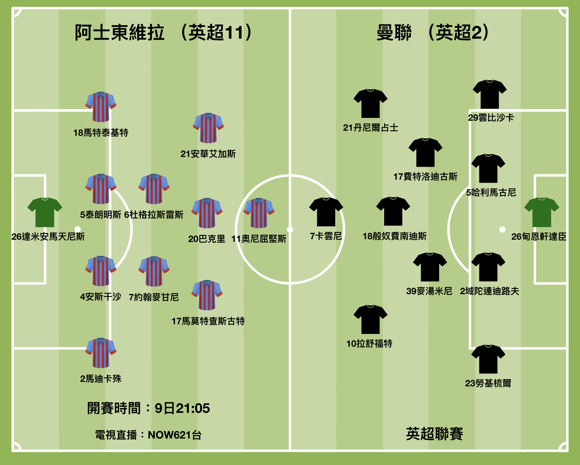 曼聯陣中的烏拉圭中鋒卡雲尼近況大勇,預計會繼續正選上陣,格連活特或會先任後備,隨時在下半場初段上陣作支援。上仗歐霸盃力挽狂瀾的迪基亞或由副選門將甸恩軒達臣替代把關。整體來講,由於卡雲尼連續兩仗都梅開二度,以其勇銳的入球能力,今仗曼聯仍有大勝把握。