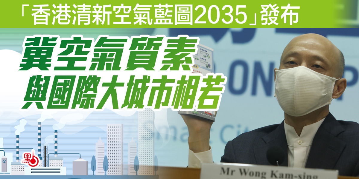 「香港清新空氣藍圖2035」提出六大主要行動涵蓋綠色運輸、潔淨能源、宜居環境、科學管理、全面減排及區域協同,冀透過每5年檢討空氣質素指標,循序漸進改善本港空氣質素,長遠符合世衞「空氣質素指引」的所有指標。