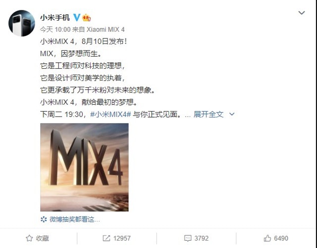 小米(1810)今日(4日)於微博公布,年度旗艦手機「MIX 4」將於8月10日的雷軍年度演講上發布。預計屆時亦會發布,包括小米平板5系列等產品。
