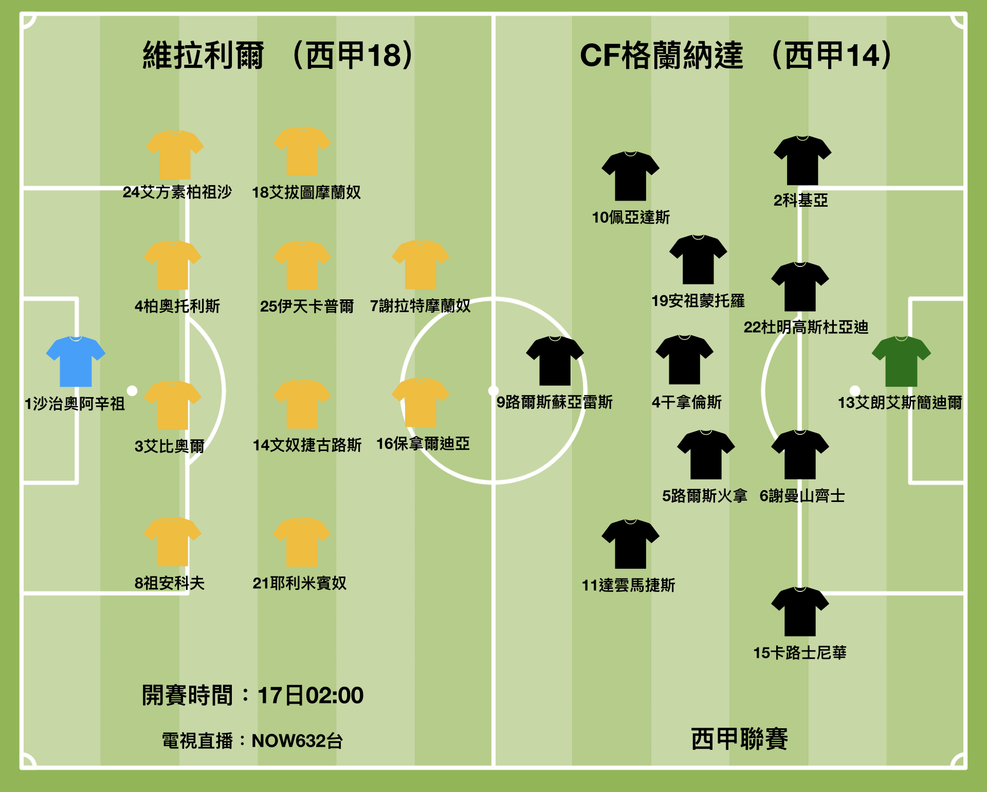 西甲在香港時間周二凌晨2時上演維拉利爾主場出戰CF格蘭納達的首輪比賽。主隊剛與英超勁旅車路士在歐洲超級盃交鋒,力戰至互射12碼落敗而失落錦標,經過這場比賽熱身後,狀態可望進一步提升,今仗有望拿下格蘭納達,全取3分。(NOW632台周二凌晨2時直播)