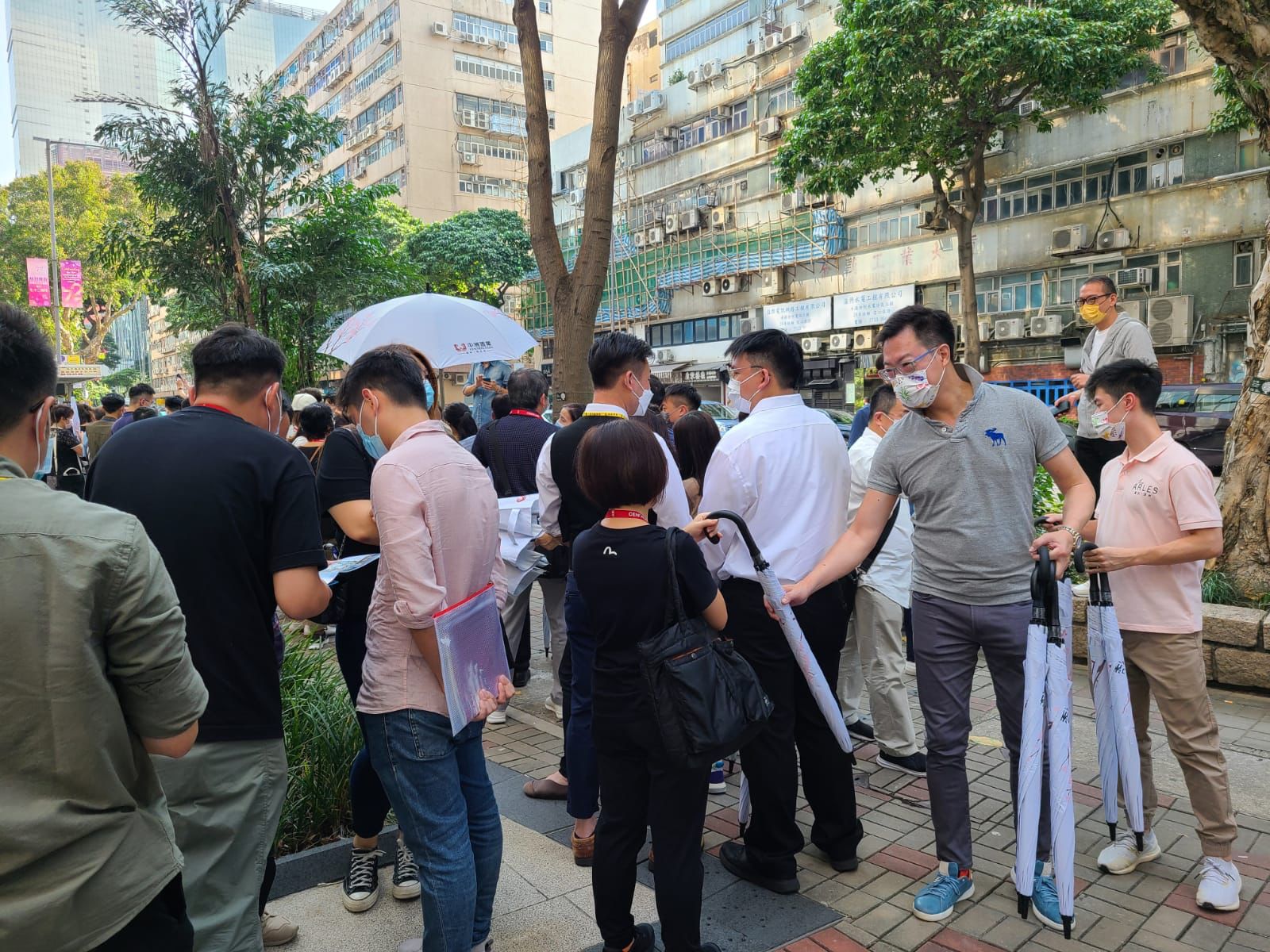 由於天氣炎熱,中洲置業行政總裁陳志興特意向排隊等候的參觀者派發雨傘及風扇,讓一眾睇樓客輪候過程更舒適。