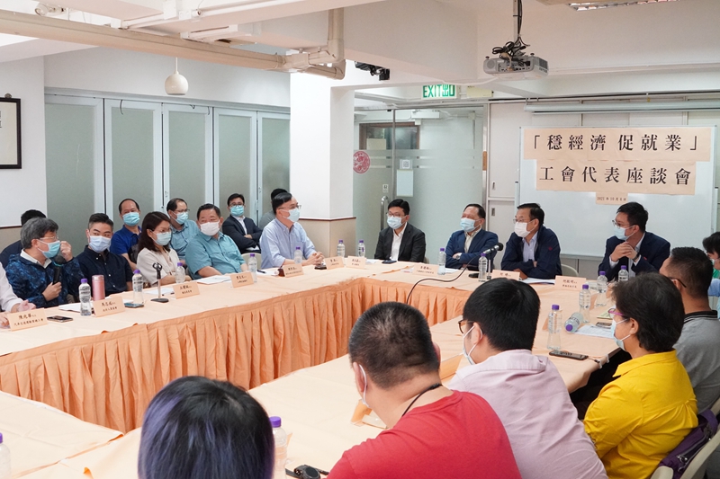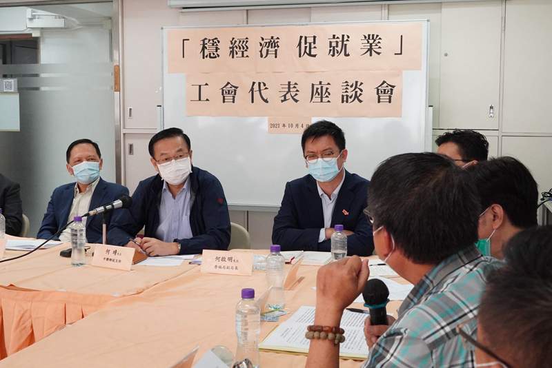 工聯會職訓委主任陳鄧源說,香港過去兩年經歷「黑暴」和疫情衝擊,航空、旅遊等行業最受影響,很多工友失業、停薪留職、被迫放無薪假。特區政府之前表示要創造6萬個臨時職位,但現時只有4萬個,仍有2萬多個缺口。海員工會梁耀全反映,港澳船員工由2019年初的1200人減至目前僅有300人,即使留職亦要減薪30%或長期放無薪假。日語導遊唐寧指出,旅遊業全面癱瘓將近兩年,大部分從業員已經轉行,希望政府增設郊野公園、傳統文化宣講員等臨時職位。酒店房務員麥淑瓊提到,隨着疫情平緩,酒店行業已逐漸恢復,從業員工作量大增,但收入沒有得到相應提升。服務業工人譚慧華激動地說,自由工作者的欠薪和歧視問題時有發生,建議政府保障最低強積金供款額,要求僱傭雙方簽訂合約。運輸業工人曾憲傑反映,超過2000名跨境司機每日往返兩地,但在香港沒有休息地方,有的只能在車上過夜,嚴重影響司機狀態。座談交流中,還有工會代表指現時失業人數18萬,但勞工處有6萬個職位空缺,存在「有工無人做、有人無工做」的錯配現象。有製造業工人更指已失業多時,平日只靠「炒散」當小販,每日賺取一二百元不夠養家。有搭棚工人亦抱怨保險費用過高「買不起」,人身安全得不到保障。
