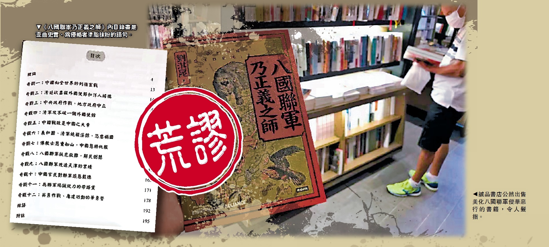 有台灣背景的誠品書店,不少學生及年輕人經常光顧。《大公報》近日接到市民投訴,指誠品書店公然出售一本名叫《八國聯軍乃正義之師》的書本,書中竟稱八國聯軍是一支因為人道危機而不得不興的「仁義之師」,歪曲八國聯軍侵略中國的史實,荒謬絕倫令人髮指,社會各界為之嘩然,紛紛譴責,更有市民向國安處舉報。