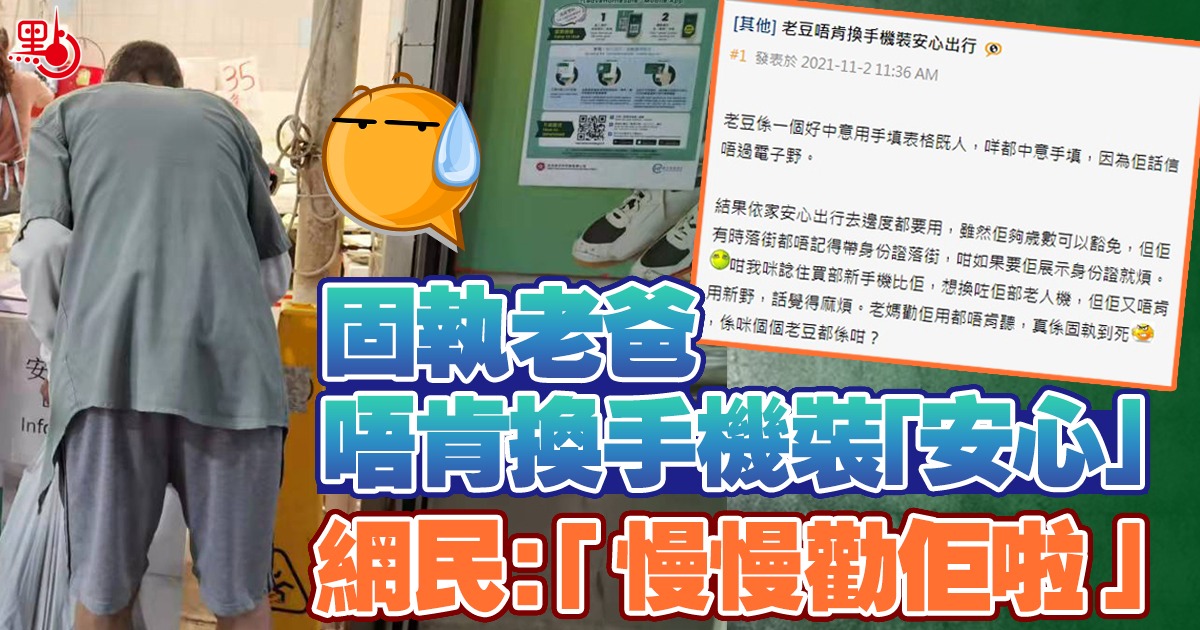 政府自本月起要求市民進入多個政府場地,必須使用「安心出行」 ,12歲以下兒童、65歲或以上長者及使用安心出行有困難的殘疾人可獲豁免。有網民在討論區發帖大呻,爸爸唔肯用新手機,話覺得麻煩,連媽媽勸都唔肯聽,真係固執到死。不少網民都勸樓主「老人家,係頑固啲㗎喇,慢慢勸佢啦」、「特殊時期,為了自身和家人健康,儘量多了解了解了」,亦有網友分享經驗話「初時我老豆都係唔肯用智能電話,自從買佐(咗)佢之後,愛不釋手,依家識開youtube睇片,玩麻將game」。
