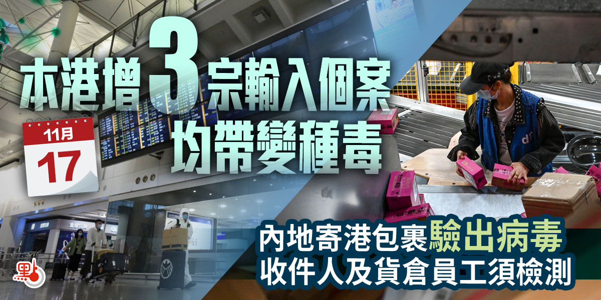 本港新冠肺炎疫情漸趨緩和,今日(17日)新增3宗輸入確診個案,全部涉及變異病毒株的感染。衞生防護中心今日公布,昨晚(16日)收到廣東省衞健委通報,內蒙古自治區在恒常檢測中發現,一份由內地寄往香港的包裹外包裝對新冠病毒檢測結果呈陽性,並已寄抵香港,請香港協助調查和跟進。