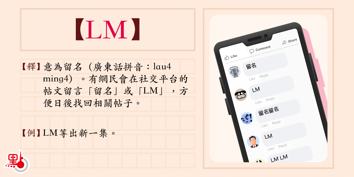 「LM」即「留名」(廣東話拼音:lau4 ming4),常見於討論區或者團購WhatsApp群組,如果想參與團購,見到「LM」,記得寫低自己的名字!