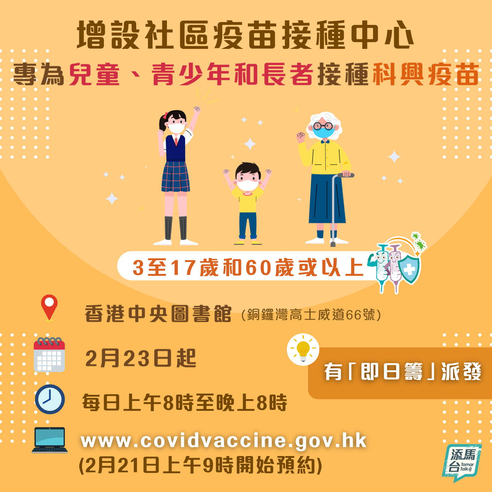 政府表示,為加快兒童、青少年和長者接種新冠疫苗,設於香港中央圖書館的專用社區疫苗接種中心將於周三(23日)投入服務,專為3歲至17歲人士和60歲或以上人士提供科興疫苗接種服務,今日(21日)上午9日起可網上預約。