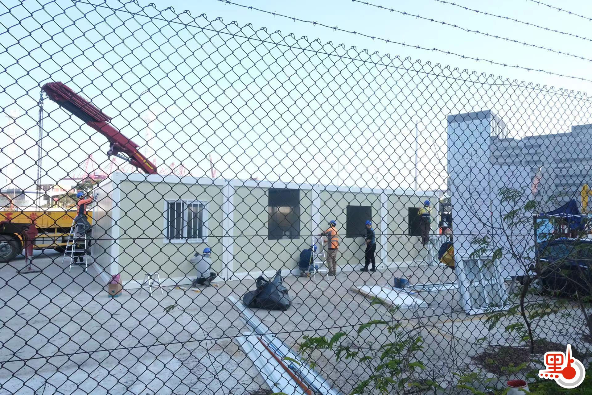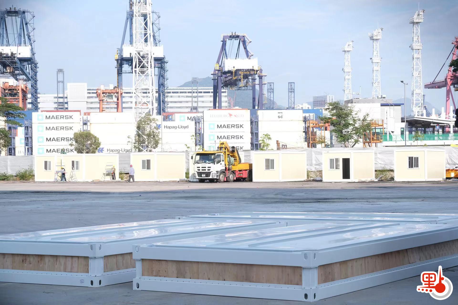 青衣貨櫃碼頭改建方艙醫院施工現場。(點新聞記者麥鈞傑攝)