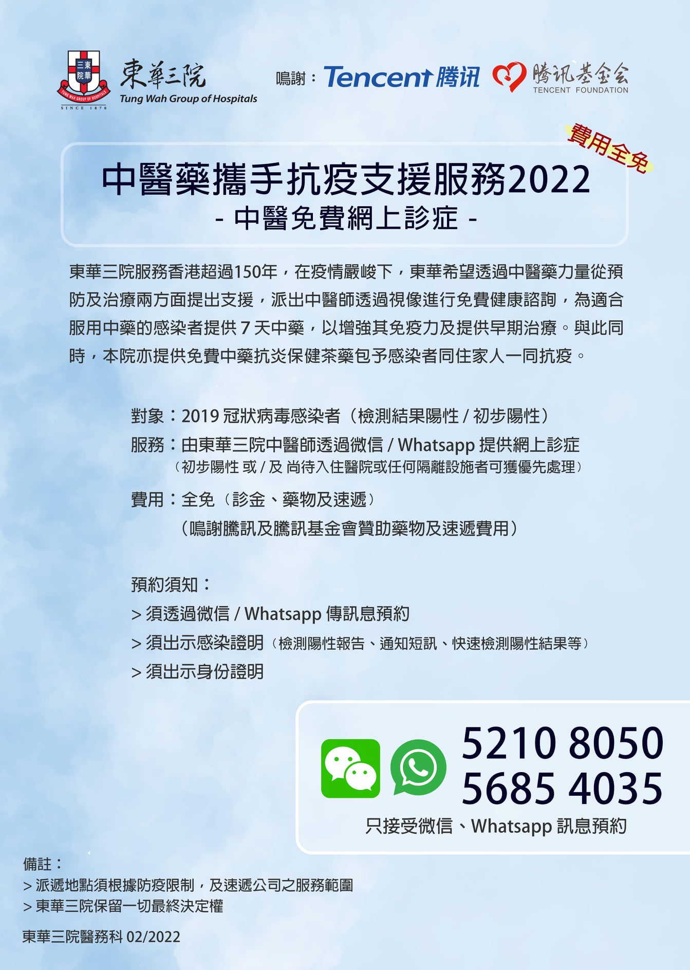 東華三院昨晚(25日)宣布,將為染疫人士提供免費網上中醫診症,診金、藥物及速遞費用全免。東華三院表示,在疫情嚴峻下,希望透過中醫藥力量從預防及治療兩方面提供支援,派出中醫師透過視像進行免費健康諮詢,為適合服用中藥的感染者提供7天中藥,以增強其免疫力及提供早期治療,東華亦提供免費中藥抗炎保健茶藥包予感染者同住家人一同抗疫。