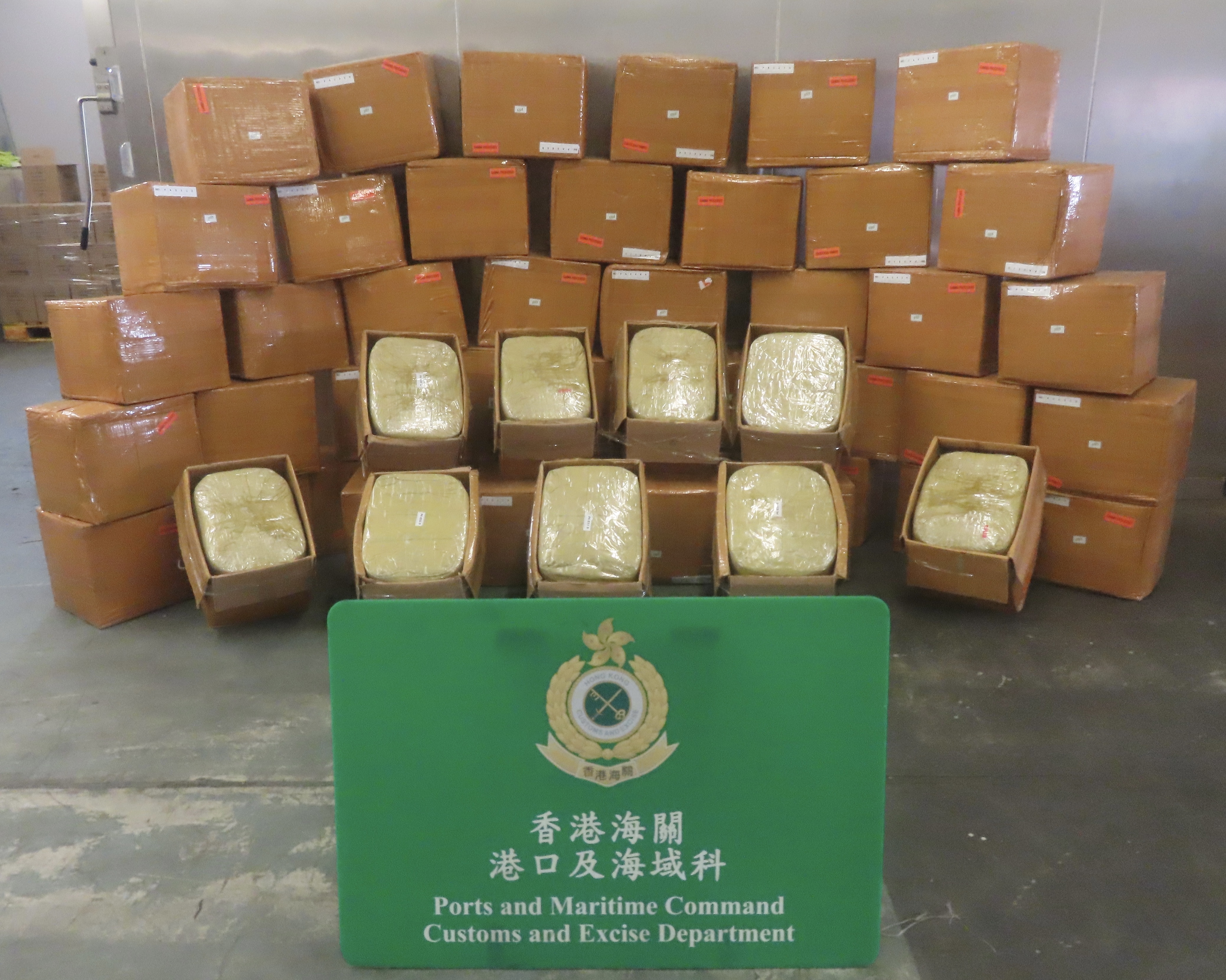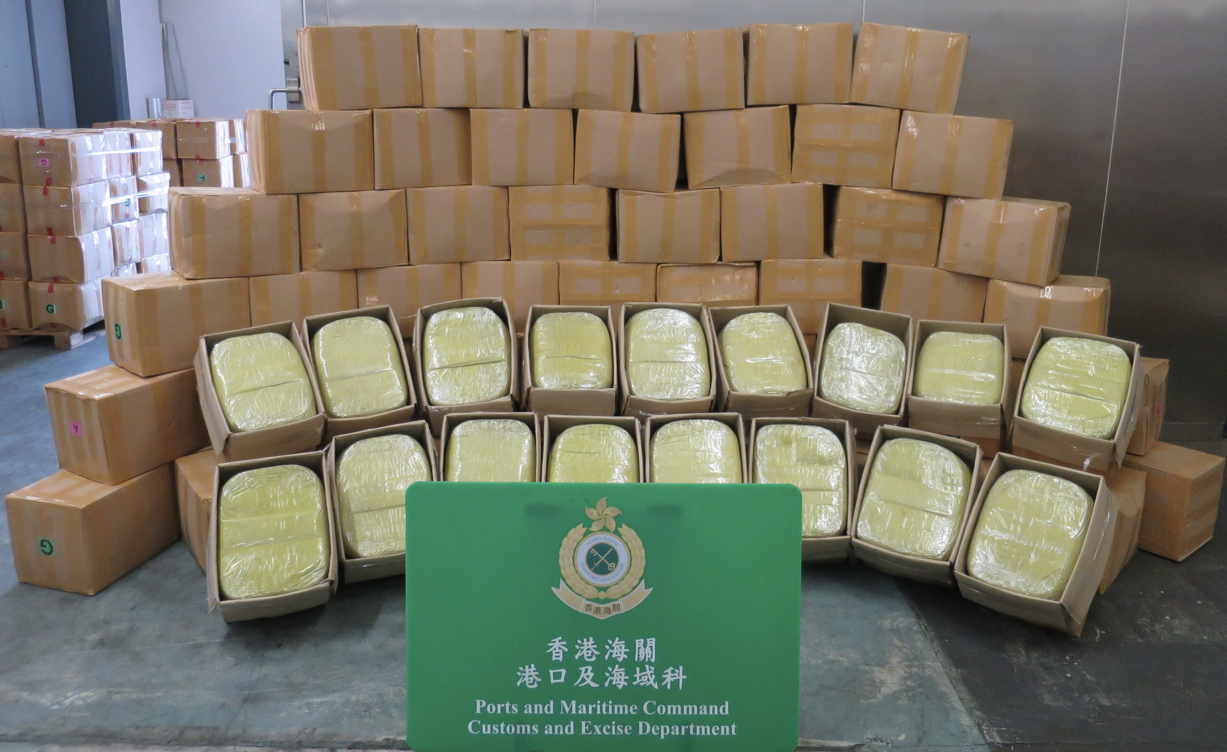 香港海關今日(15日)表示,在上周二和昨日在葵涌海關大樓驗貨場檢獲共約52公噸懷疑帽柱木鹼,估計市值約1.38億。