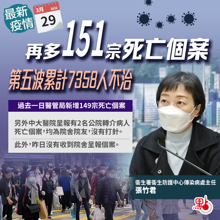 張竹君公布,醫管局新增149宗死亡個案。另外中大醫院呈報有2名公院轉介病人死亡個案,均為院舍院友,沒有打針;其中一名89歲男子,有慢性病史,3月5日快測呈陽性,3月27日轉陰,死於細菌性肺炎,判斷不是因新冠致死;另外一名為106歲女子,有腎衰,3月15日快測呈陽性。此外,昨日沒有收到院舍呈報個案。