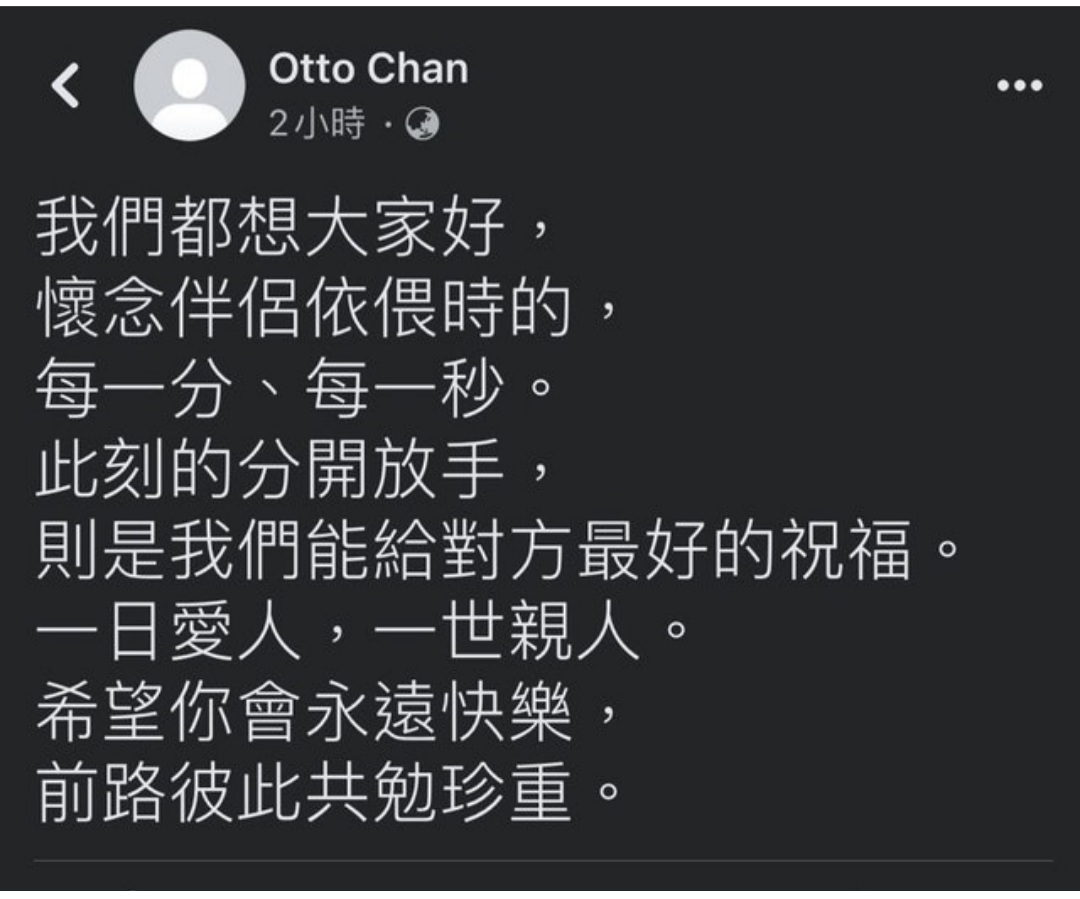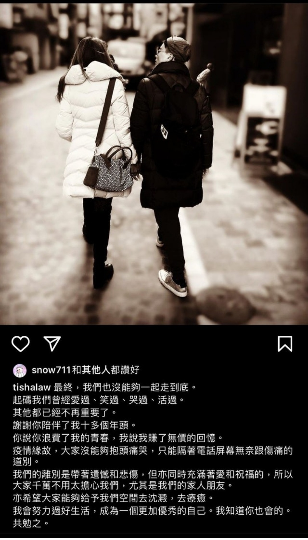 羅苡之於IG上載與陳志健的黑白背影照,關閉了留言功能,表示雖然未能走到最後,但亦有慶幸之處:「起碼我們曾經愛過、笑過、哭過、活過。其他都已經不再重要了。謝謝你陪伴了我十多個年頭。你說你浪費了我的青春,我說我賺了無價的回憶。疫情緣故,大家沒能夠抱頭痛哭,只能隔着電話屏幕無奈跟傷痛的道別。我們的離別是帶着遺憾和悲傷,但亦同時充滿著愛和祝福的,所以大家千萬不用太擔心我們,尤其是我們的家人朋友,亦希望大家能夠給予我們空間去沈(沉)澱,去療癒。我會努力過好生活,成為一個更加優秀的自己。我知道你也會的。共勉之。」
