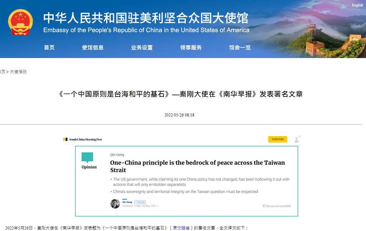 中國駐美國大使秦剛在《南華早報》發表題為「一個中國原則是台海和平基石」的署名文章,指最近有人炒作所謂「今日烏克蘭、明日台灣」。