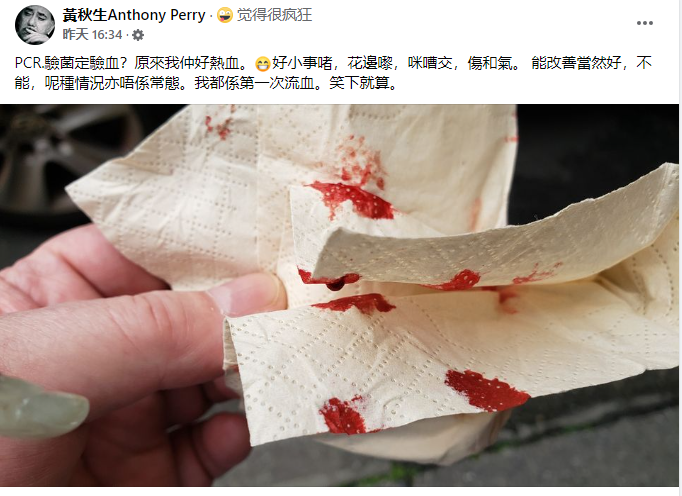 繼「黃絲」藝人王喜自曝入境台灣做PCR檢測鼻子被「捅傷」事件後,另一「黃絲」藝人黃秋生於昨日(28日)在社交平台發文稱「驗菌定驗血?」並上載有血跡斑斑的紙巾相片,疑似在台灣做PCR檢測時,造成鼻子流血,帖文引發網友熱議。