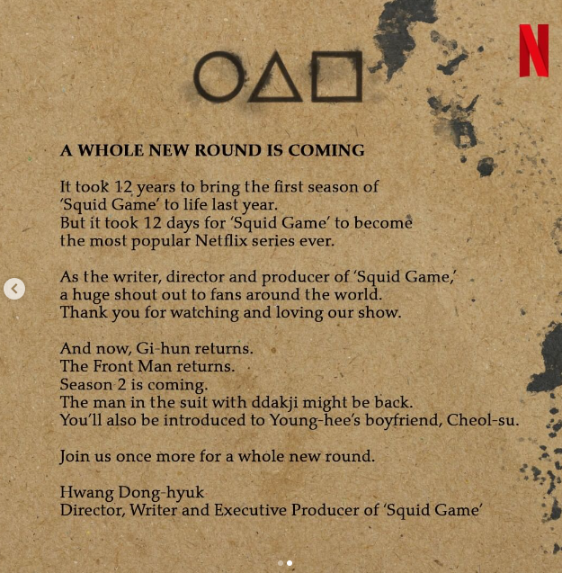 黃東赫在給全球影迷的信中透露,《魷魚遊戲》的策劃始於12年前,在去年開花結果,「上線12天成為Netflix史上最受歡迎的影集」。他表示作為該劇集的編劇、導演以及製片,衷心感謝全球粉絲的支持和愛戴。