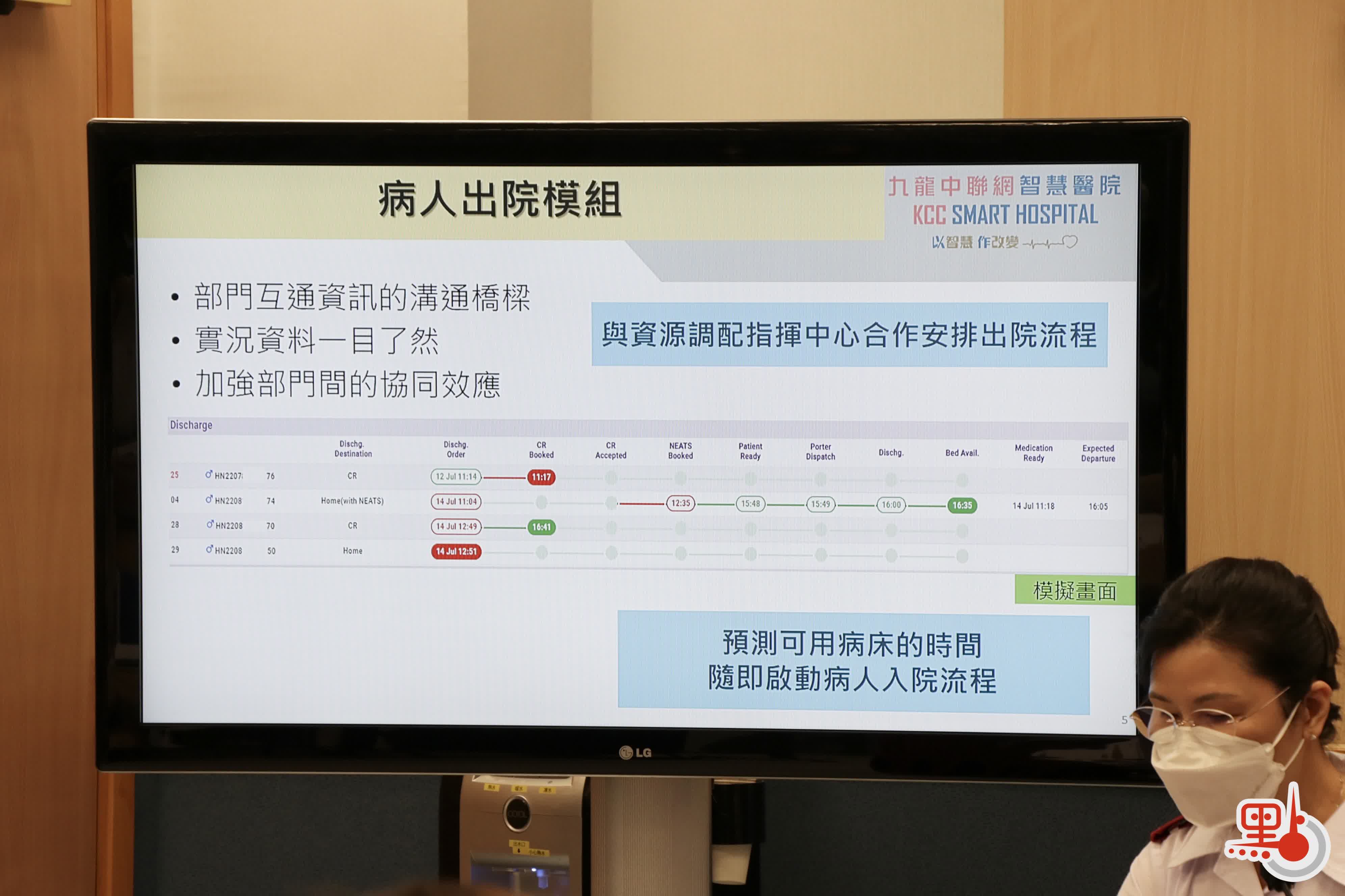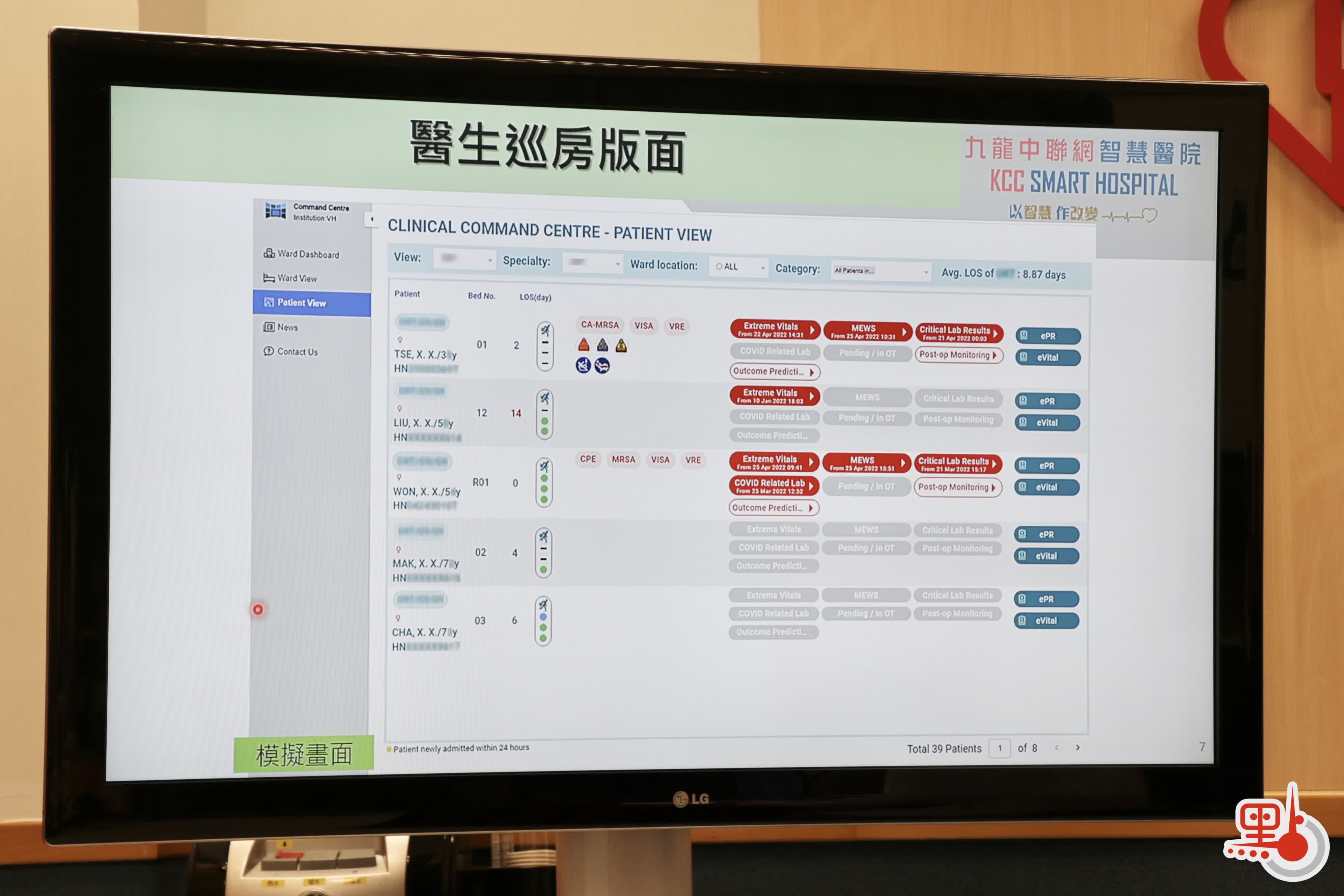 在臨床作業系統管理方面,九龍中醫院聯網資訊科技統籌、伊利沙伯醫院神經外科顧問醫生麥凱鈞表示,指揮中心按照「以病人為中心,以病人為本」的理念運行,整合病人資訊於同一平台,好處有二:一方面可以通過及早發現病情惡化的病人,識別有風險的病人,減少延誤,從而提升病人安全及服務質素;另一方面可以在巡房時及早識別需要優先處理的病人,方便跨部門和專科會診,亦便於監察病人的維生指數,如血壓、心跳等,還可以通過系統預約各項檢查和手術,並用人工智能驅動臨床決策,從而提升醫院整體運作效率。