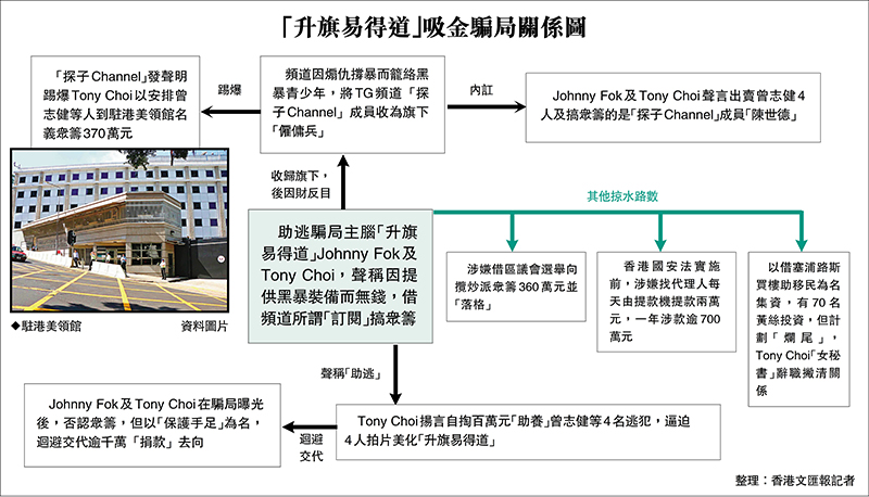 警方國安處本月中偵破窩藏曾志健4名黑暴案被告及助逃的「食人血饅頭」大騙局,調查目標直指總部設在英國的援暴組織「升旗易得道」,將逃犯當作「禁室人肉提款機」,逼4人拍片賣慘,借機眾籌吸金及撈取政治資金,最後用完棄之。昨日有周刊曝光4名逃犯被迫自拍「感恩」片,以及被指呃錢的「易得道」主持人訪問。據香港文匯報了解,該片段是「易得道」借涉襲警暴青曾志健等人之口為其斂財騙局預先製作的「洗白」之作,之後仍有逼迫4人拍「求救」片,繼續拿來吸金。據悉,警方相信是該援暴組織內各路人馬各懷鬼胎,借曾志健吸金,現因為曾志健潛逃「爛尾」而互揭「爛賬」,且越揭越臭,估計曾志健令援暴組織吸金數千萬之多,但付出的成本僅百萬元,而「易得道」如今仍在網台講大話延續騙局。