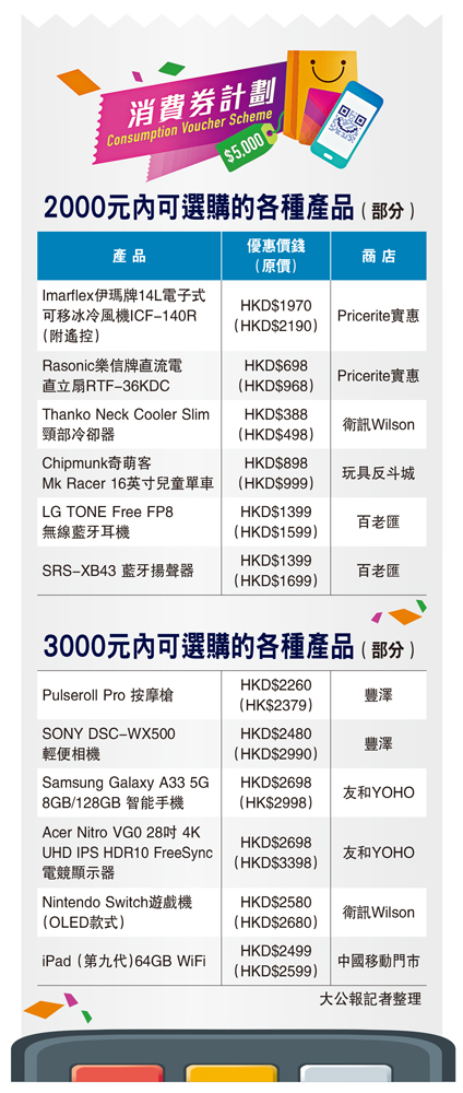 一間連鎖家品店的門口當眼處,已擺放了一個消費券優惠一覽顯示屏,店內有不少人在預選心頭好。張小姐與男友來看小型的飾物櫃,「這個一千多元的就很合適,剩下的錢還可以用來與男朋友吃飯。」