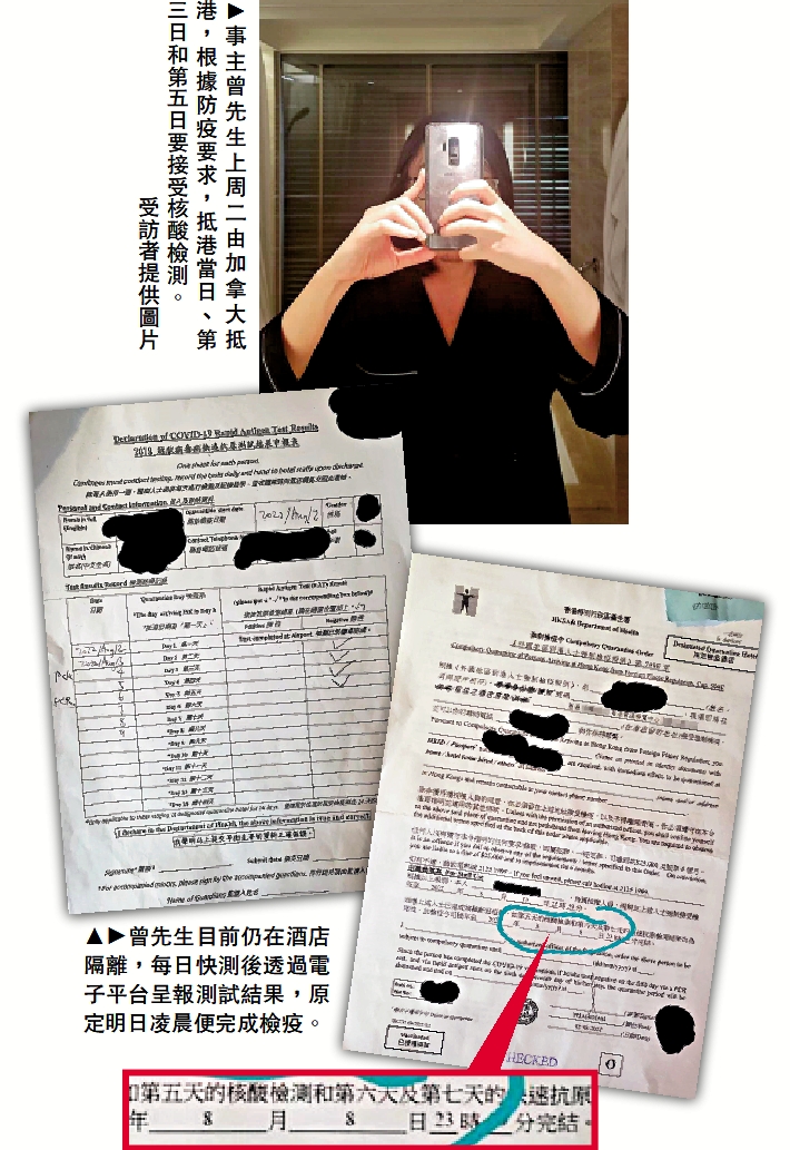 事主曾先生於上周二(2日)由加拿大抵港,入住灣仔一間檢疫酒店隔離7日。根據防疫要求,他必須每日呈交快測結果,並在他抵港當日、第三日和第五日接受PCR核酸檢測,只要在第七日快測和核酸檢測全部呈陰性,即可以在第八天(9日)離開酒店。