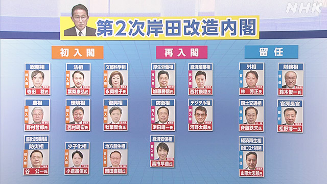 據日本放送協會(NHK)報道,內閣官房長官松野博一於當地時間10日下午,在記者會上正式公布首相岸田文雄內閣改組名單,共有9人首次入閣,5人為再入閣,還有5人留任。