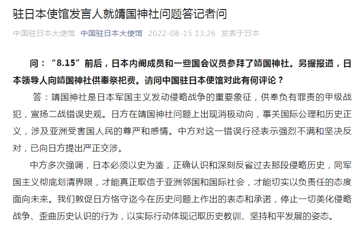 中國駐日本大使館發言人今日(15日)就靖國神社問題答記者問時表示,靖國神社是日本軍國主義發動侵略戰爭的重要象徵,供奉負有罪責的甲級戰犯,宣揚二戰錯誤史觀。日方在靖國神社問題上出現消極動向,事關國際公理和歷史正義,涉及亞洲受害國人民的尊嚴和感情。中方對這一錯誤行徑表示強烈不滿和堅決反對,已向日方提出嚴正交涉。