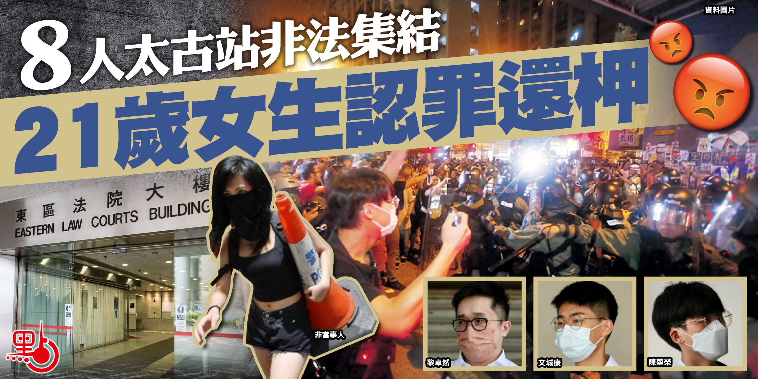 在2019年8月11日全港多區有示威堵路行動,警方入夜後於港鐵太古站附近拘捕多人,其中7男1女被控參與非法集結等罪。案件昨在東區裁判法院開審前,女被告改口承認非法集結罪,須還柙至9月29日待求情及判刑,其間索取背景報告;另有一男被告承認無牌管有無線電通訊器具罪,但否認非法集結,與其餘6名被告繼續受審。