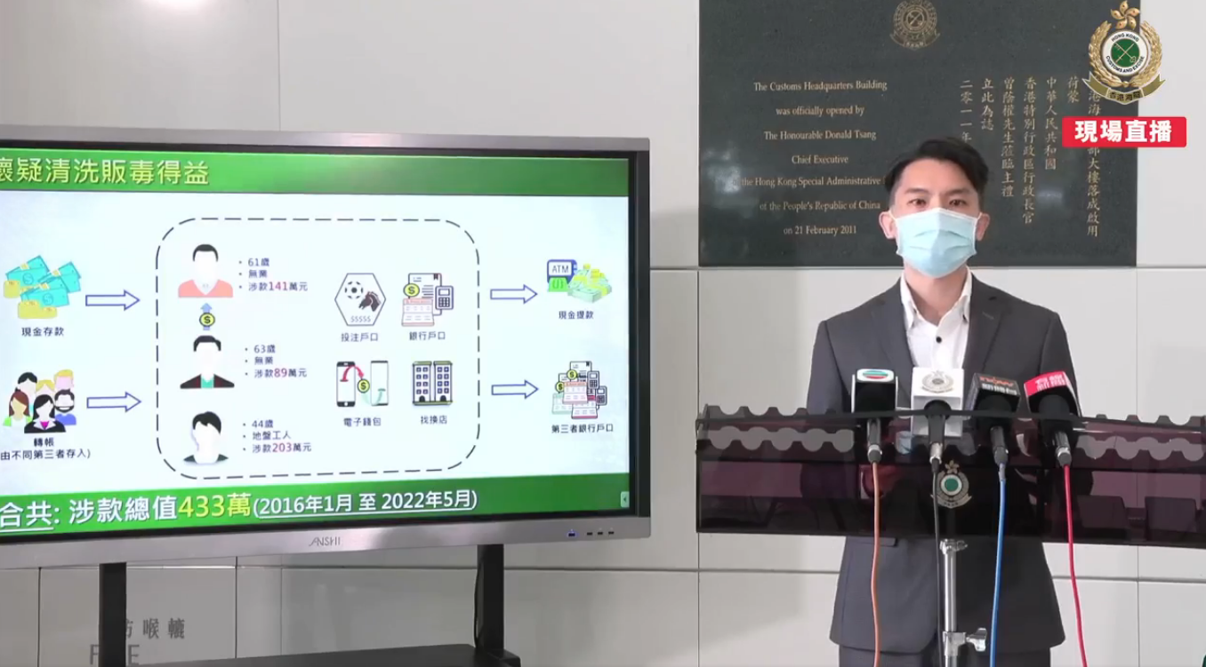 香港海關於今年5月偵破一宗8600萬港元販毒案,當時檢獲約64萬現金,並以涉嫌「洗黑錢」拘捕1名男子。海關有組織罪案調查科財富調查組展開跟進調查,透過追蹤資金往來,再鎖定另外2名男子,涉嫌於2016年1月至2022年5月,透過投注戶口、個人銀行戶口、電子錢包、找換店等方式,處理約433萬港元販毒得益。