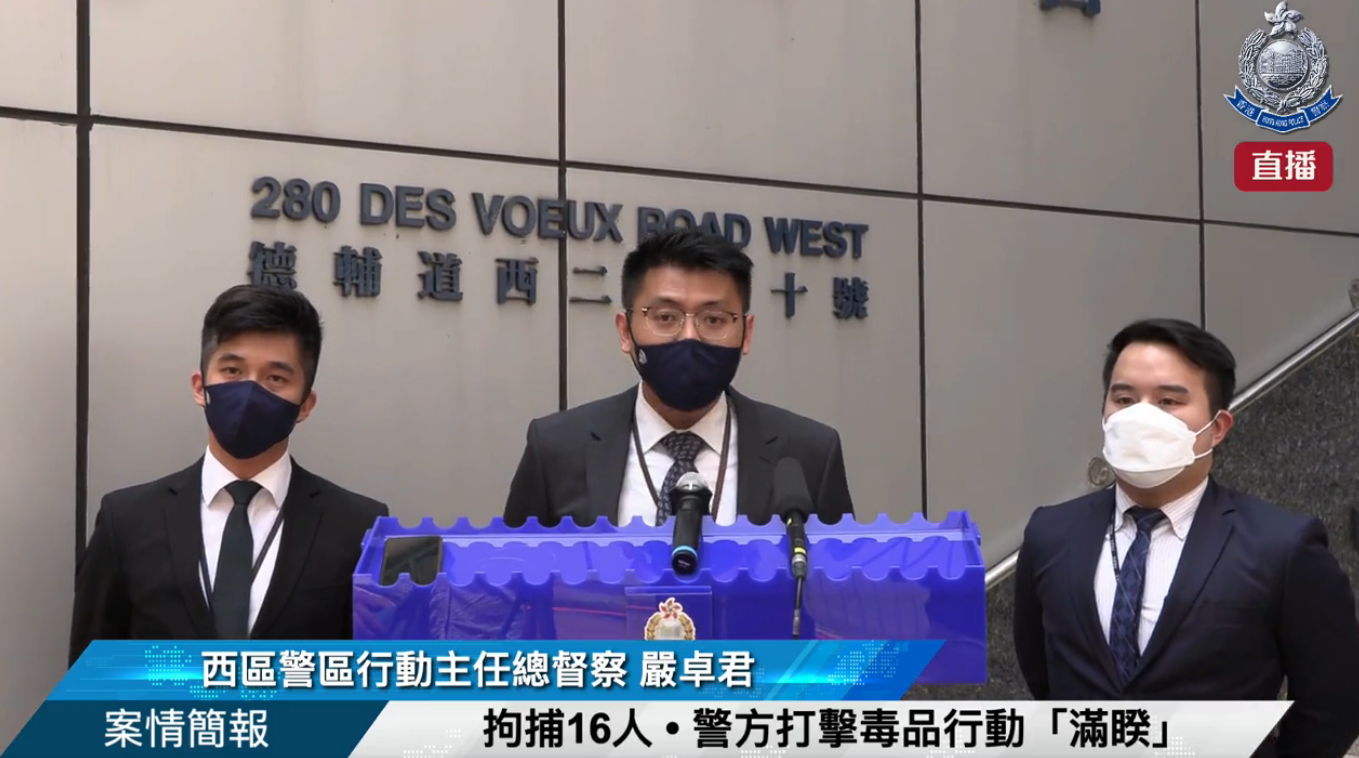 西區警區行動主任總督察嚴卓君表示,警方關注近年青少年吸食毒品情況,留意到有不法分子透過Telegram等網上平台,以廣告或關鍵字搜尋方式,吸引青少年接觸毒品,並散播誤導大麻不是毒品的資訊,並以金錢或免費毒品利誘青少年販毒。毒品調查科於今年7月至8月派員在網上搜集情報,鎖定一批毒販身份後,一連三日(13日至15日),展開代號「滿睽」的反毒品行動,突擊搜查多個地點,以「販運危險藥物」拘捕16人,當中6人尚未成年,其中3人僅15歲。行動中警方搜查2個分別位於大角咀的工廈,以及尖沙咀1間賓館的毒品儲存倉,合共檢獲約400克大麻花及約200克俗稱「K仔」的氯胺酮,市值約20萬港元。