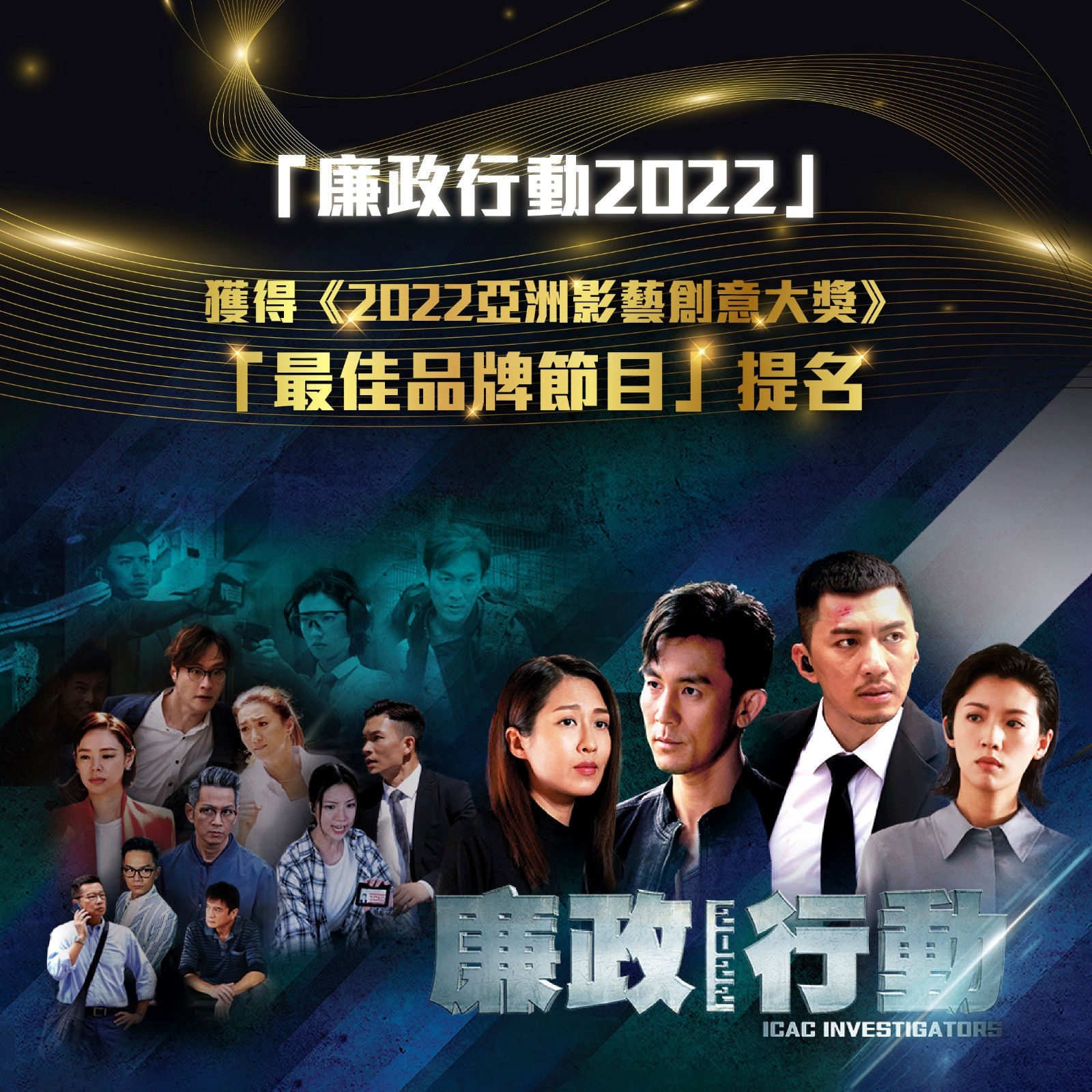 廉政公署今日(7日)公布,劇集《廉政行動2022》獲得《2022亞洲影藝創意大獎》中「最佳品牌節目獎」香港區優秀作品,並入圍「最佳品牌節目」提名名單,將於今年12月代表香港與亞洲其他地區競逐最終奬項。