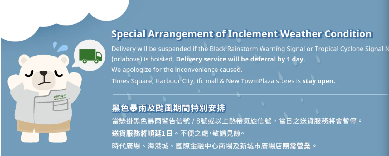 c!ty'super各大門市將照常營業。當懸掛黑色暴雨警告信號、8號或以上熱帶氣旋信號,當日的送貨服務將會暫停並順延1日。分店位於海港城港威商場、國際金融中心商場、時代廣場、新城巿廣場。