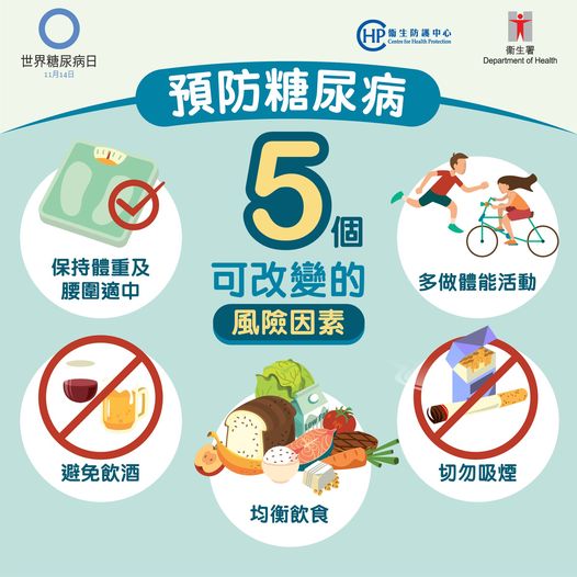 為響應訂於每年11月14日的「世界糖尿病日」,衞生署發言人提醒市民可從簡單易行的途徑實踐健康生活模式,以大大降低罹患二型糖尿病的風險,例如多做體能活動、保持均衡飲食、維持健康的體重,以及避免吸煙和飲酒。