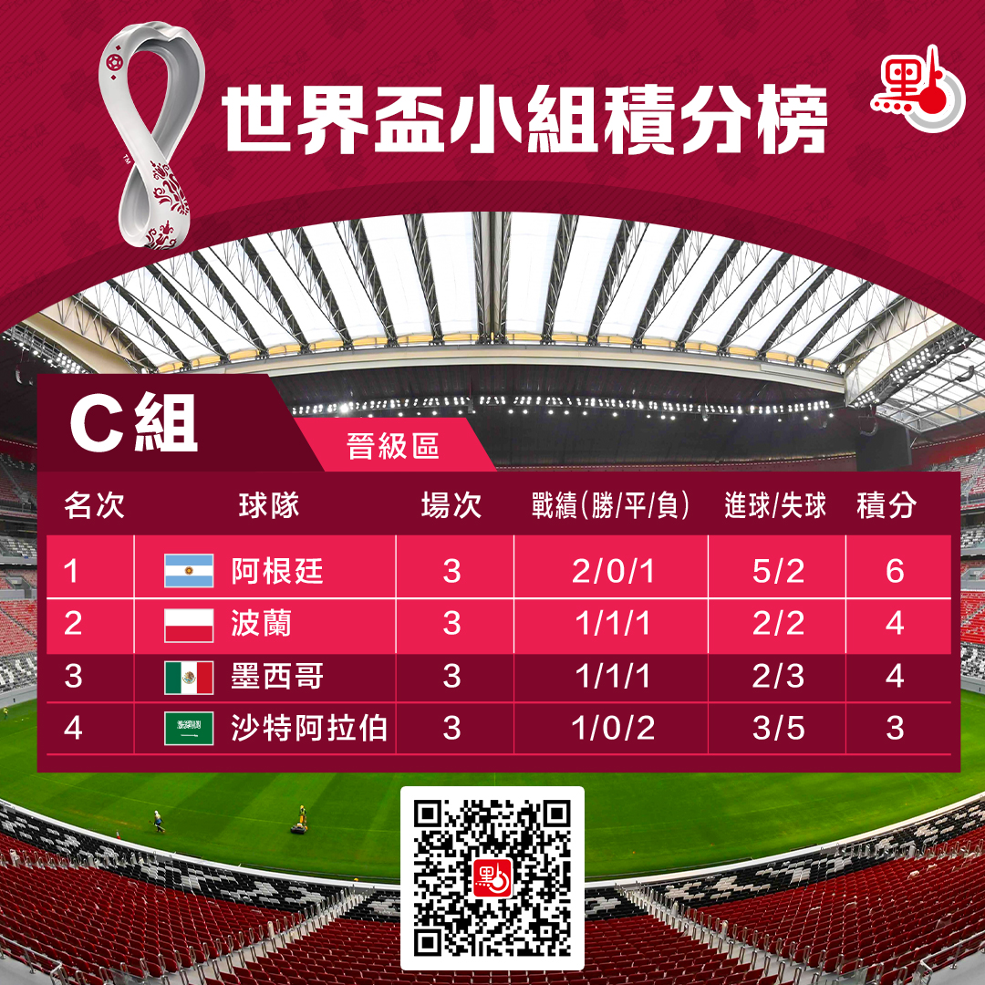 阿根廷在首戰爆冷不敵沙特阿拉伯之後,連下2城積6分,以C組第一身份晉級16強,將迎戰澳大利亞隊,波蘭(0)在淨勝球多於墨西哥(-1)的情況下,以分組第二晉級16強,將迎戰衛冕冠軍法國隊。