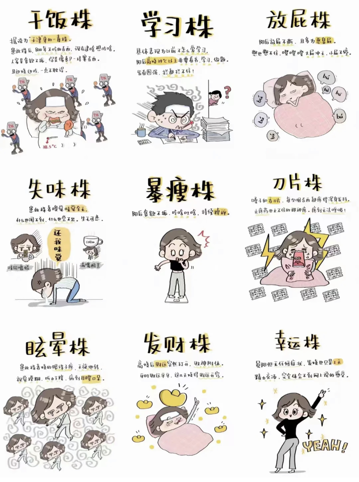 近期,各種社交平台上都流傳着:刀片株、失味株、眩暈株、暴瘦株、斬腰株、幸運株、發財株等等不同說法的病毒株,那是因為新冠感染者會根據自身病況來定義自己的病毒株,有的人會食慾不振,有的人會頭昏腦漲,甚至還有些人會胃口大開,也有的人沒有任何症狀。那麼面對不同的毒株時,感染者應該如何去應對?