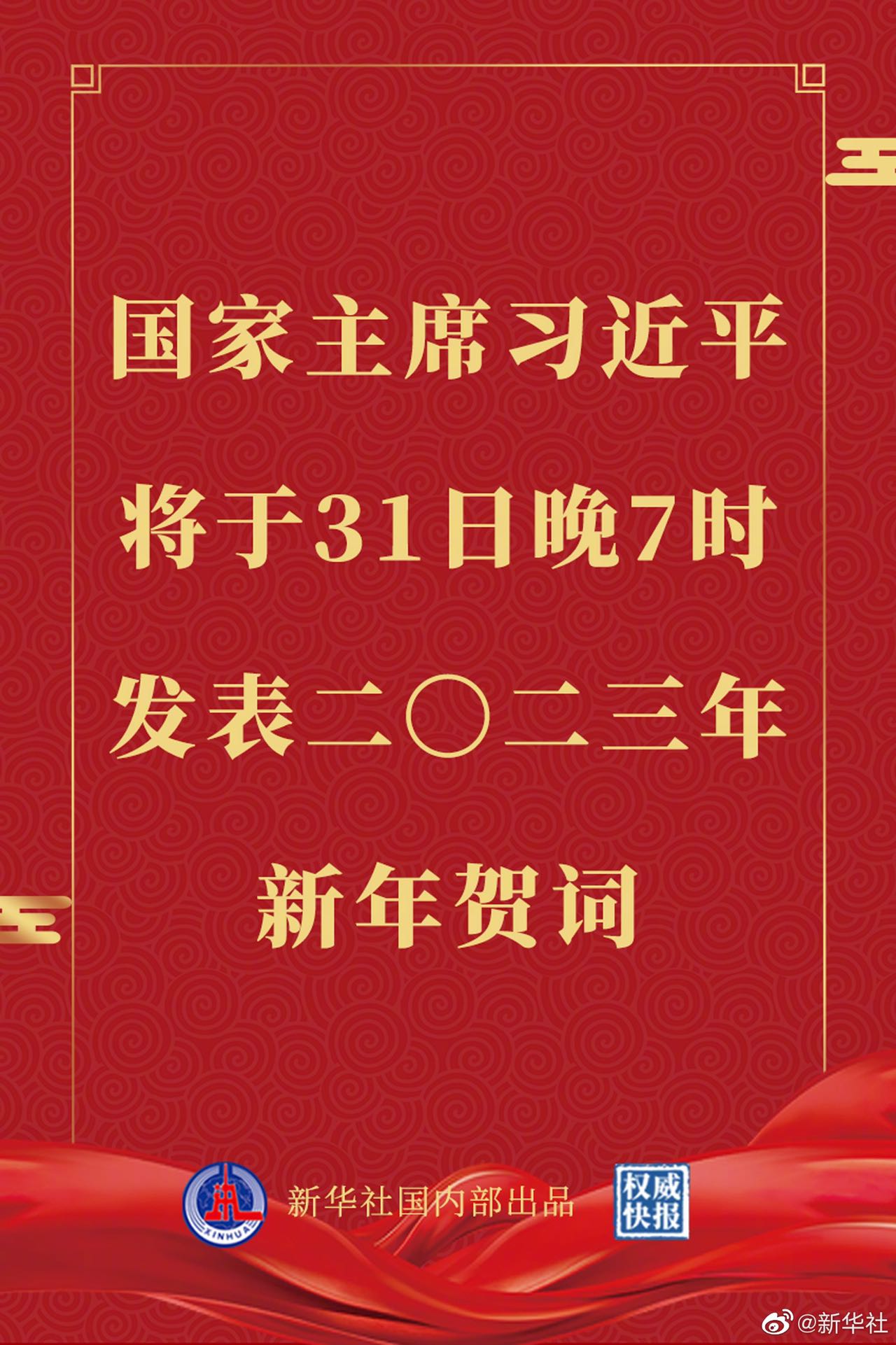 據新華社報道,國家主席習近平將於12月31日晚7時,通過中央廣播電視總台和互聯網,發表二〇二三年新年賀詞。