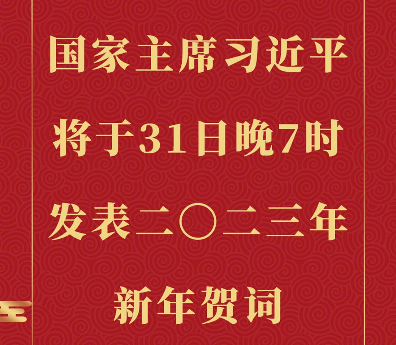 國家主席習近平將於12月31日晚7時,通過中央廣播電視總台和互聯網,發表二〇二三年新年賀詞。當晚7時,點新聞網、點新聞YouTube頻道將同步直播,敬請關注。