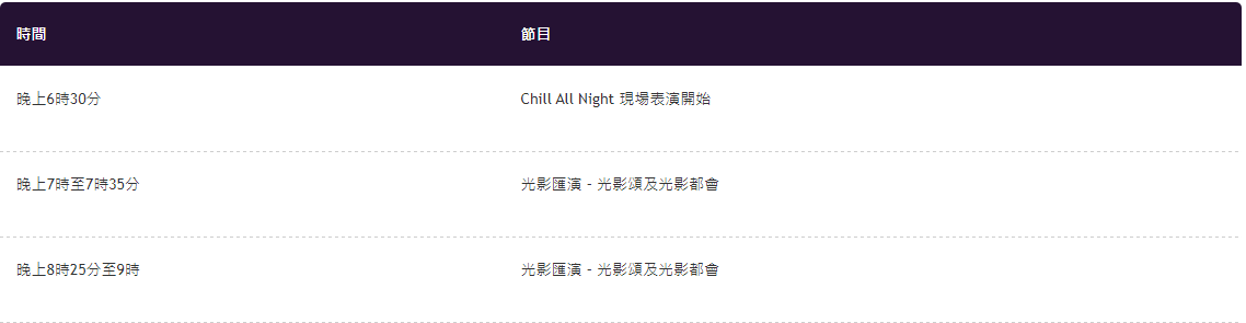 在逢星期六晚上6時30分至9時,海洋公園將上演兩大光影匯演「光影頌」及「光影都會」,園內海龍王餐廳、爐炭燒、食尚水都、夢幻水都人工湖及海濱禮品廊繼續開放,其他景點則將於當天日間設施關閉時間停止運作。入場人數有限,額滿即止。如訪客只參與該活動,則無須於網上預約系統預約入園。