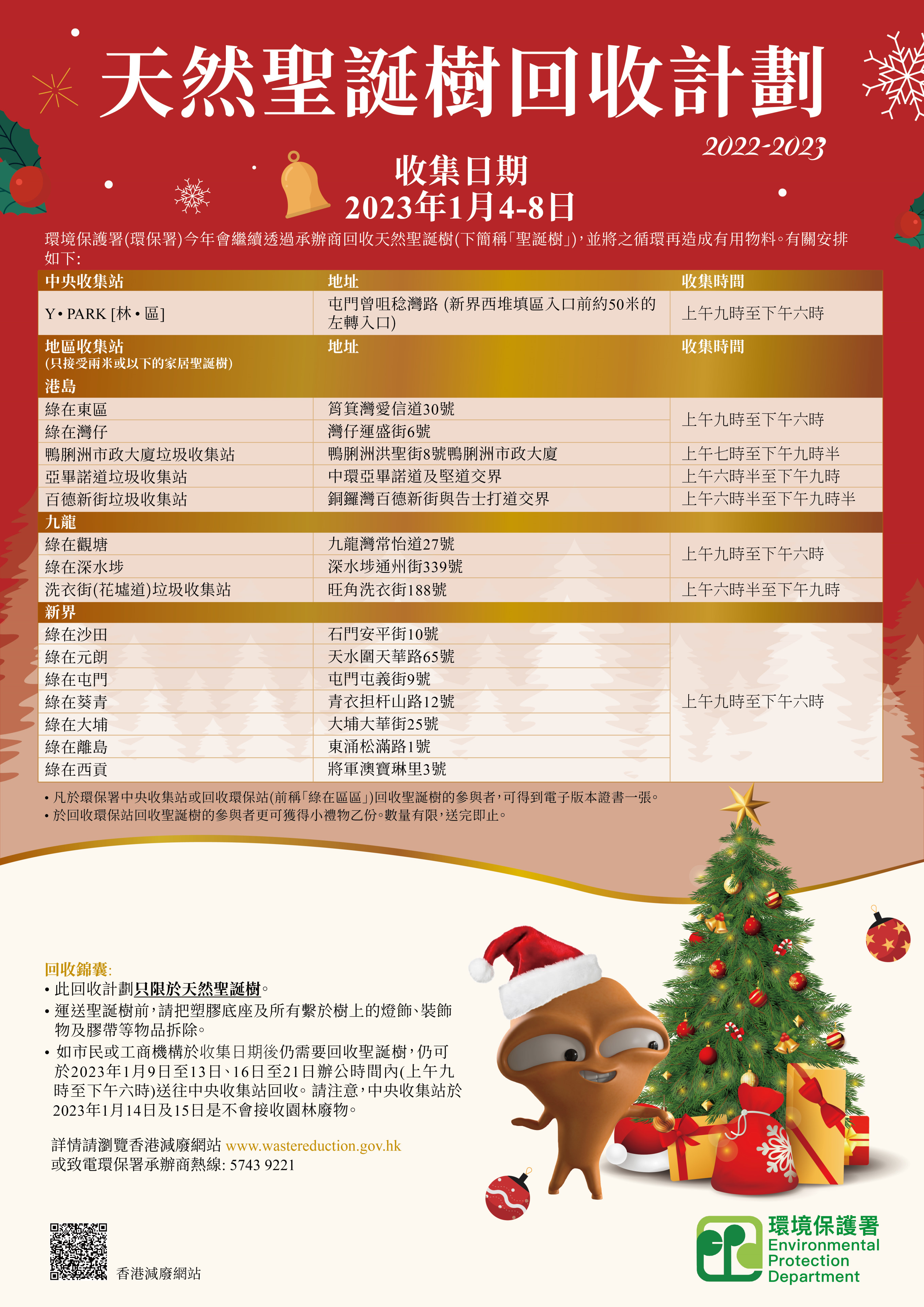 局方提醒,如市民或工商機構於2023年1月9日至13日、16日至21日期間需要回收聖誕樹,需要於辦公時間內(上午9時至下午6時)將天然聖誕樹直接送往中央收集站回收。中央收集站於2023年1月14日及15日不會接收任何的園林廢物。