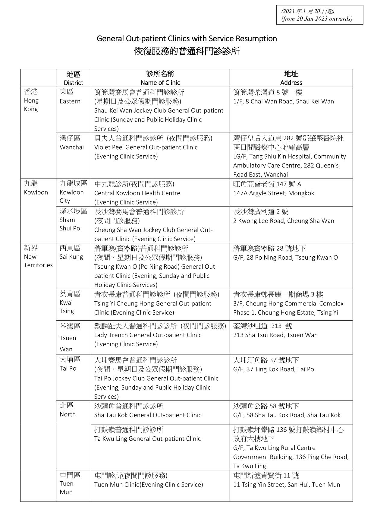 醫管局今日(18日)宣布,經檢視近日的服務情況後,11間普通科門診診所由周五(20日)起恢復部分早前暫停的服務,包括周日及公眾假期和夜間門診服務。醫管局會繼續密切監察疫情的情況及服務需求,按實際情況恢復更多早前暫停的服務。