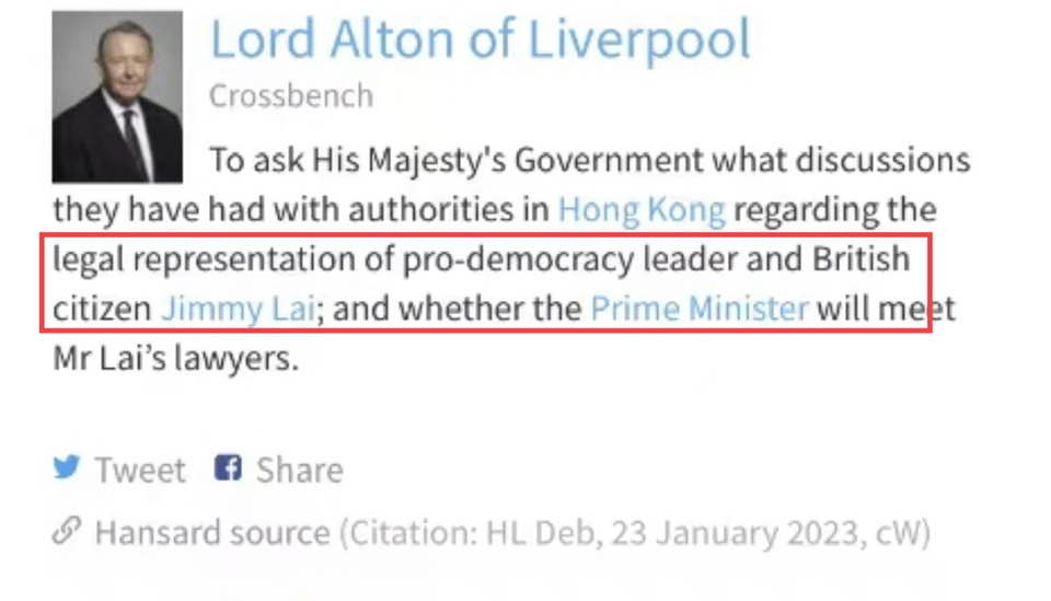 亂港黑手黎智英的三子黎崇恩日前與英國國會議員會面,乞求蘇納克立即採取行動「讓黎智英獲釋」。英國利物浦的阿爾頓勳爵(Lord Alton of Liverpool)日前質詢英國政府就「民主倡導者」、英國公民黎智英的「海外法律團隊」的相關討論。全國政協副主席梁振英今日(26日)在其社交媒體發文,批相關發言是可笑的自相矛盾。