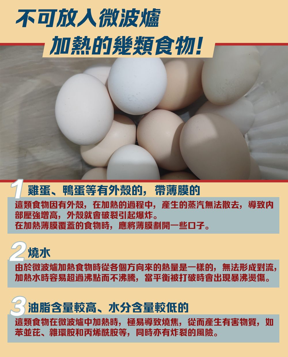 例如,煮好的雞蛋若感覺涼了,想加熱後再吃,切記不可放入微波爐加熱,否則蛋沒有吃到,還要花費數小時清理蛋爆炸而弄髒的設備內部。除了雞蛋以外,還有以下這些食物,都不能放入微波爐加熱。