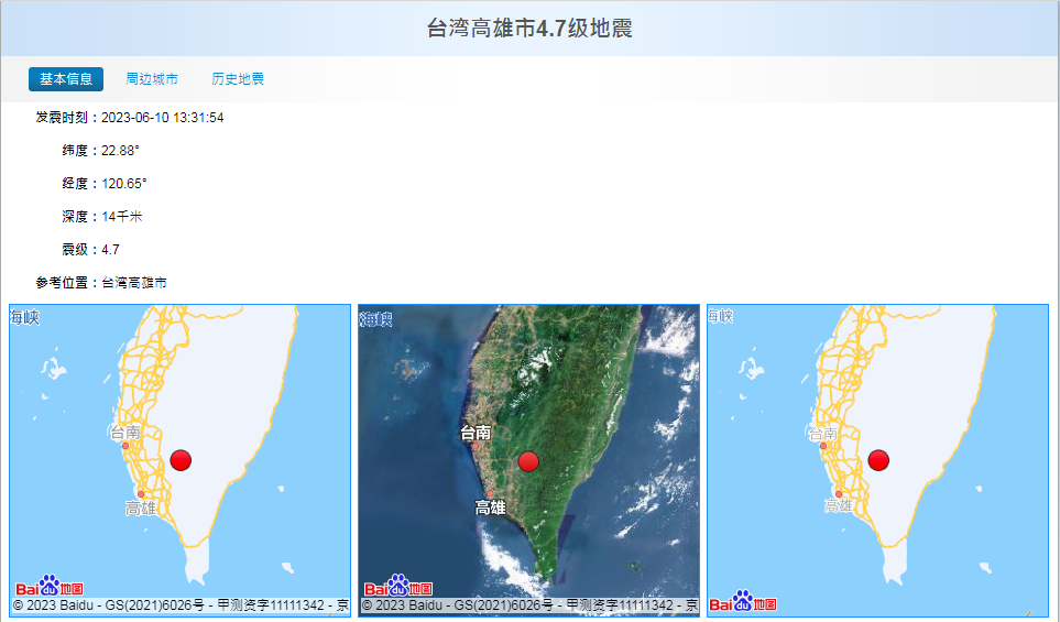 中國地震台網正式測定:6月10日13時31分在台灣高雄市(北緯22.88度,東經120.65度)發生4.7級地震,震源深度14千米。